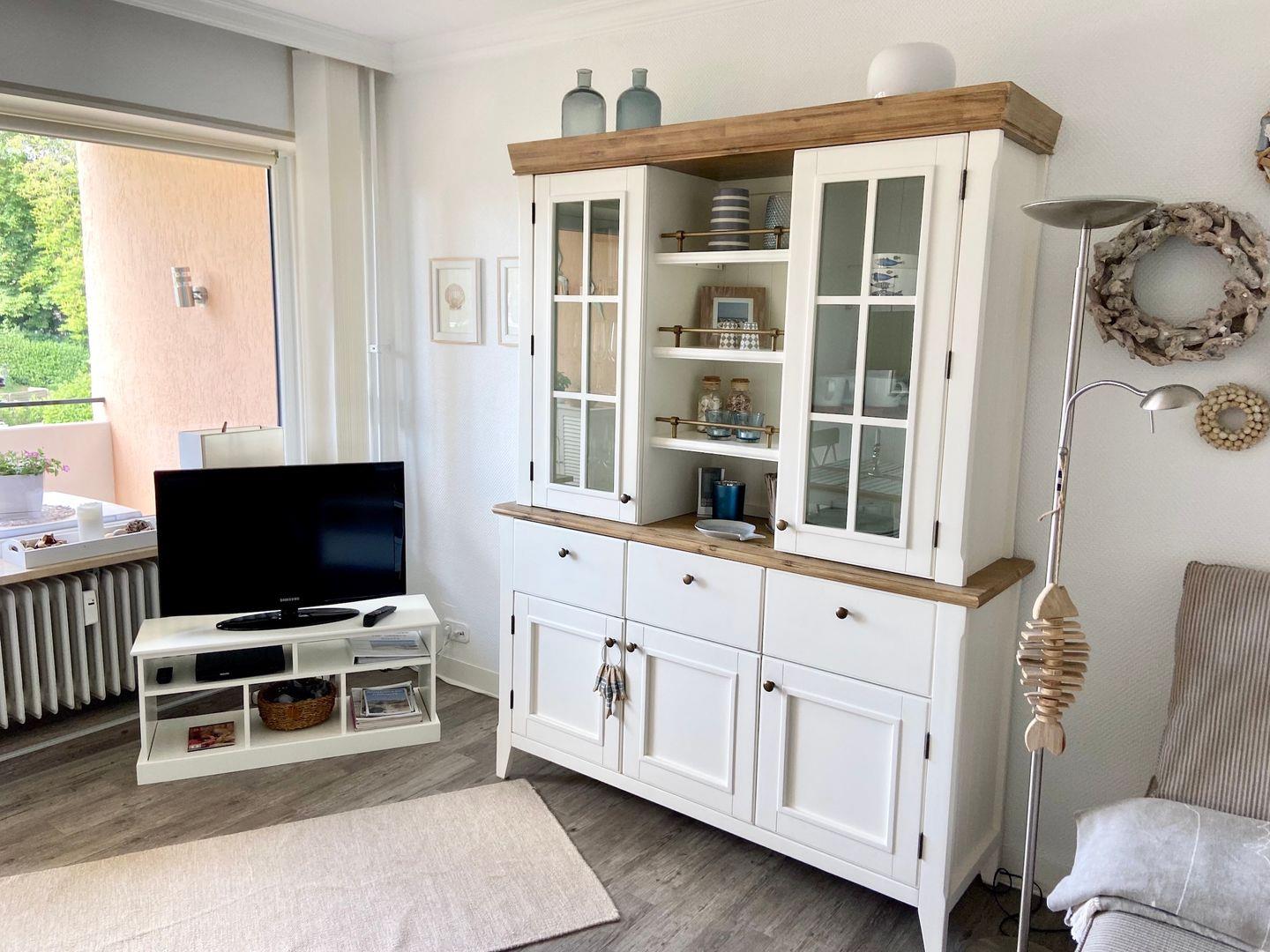 Das helle und gemütliche Wohnzimmer bietet Ihnen einen Flachbildfernseher, kostenlosen WLAN-Zugang und einen DVD-Player zur Unterhaltung. Von hier aus gelangen Sie auch auf den Balkon mit Blick ins Grüne.