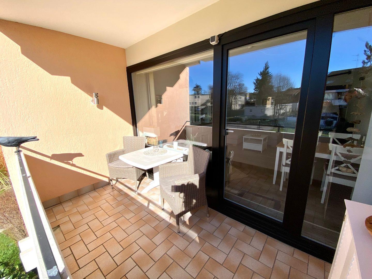 Komfortables Appartement in Grömitz mit Balkon, Gartenblick und Nähe zum Zoo für entspannte Ferien.
