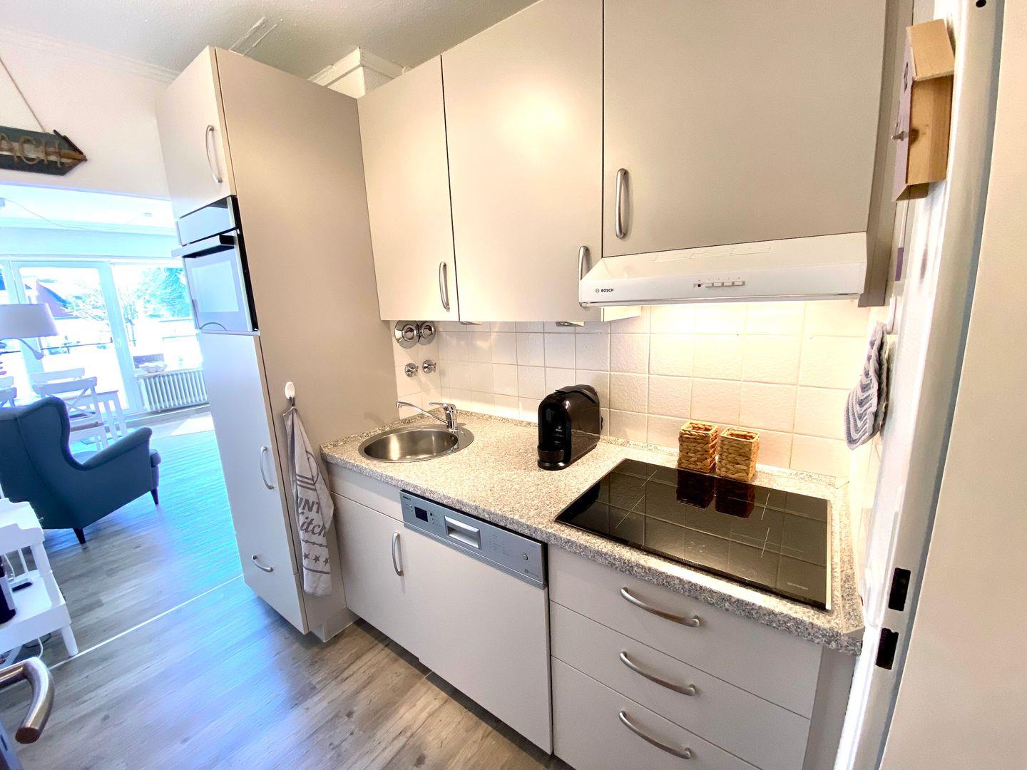 Hell und modern präsentiert sich auch die kleine, aber perfekt ausgestattete Küche mit Spülmaschine, Cerankochfeld, Backofen und Kühlschrank mit Gefrierfach.
