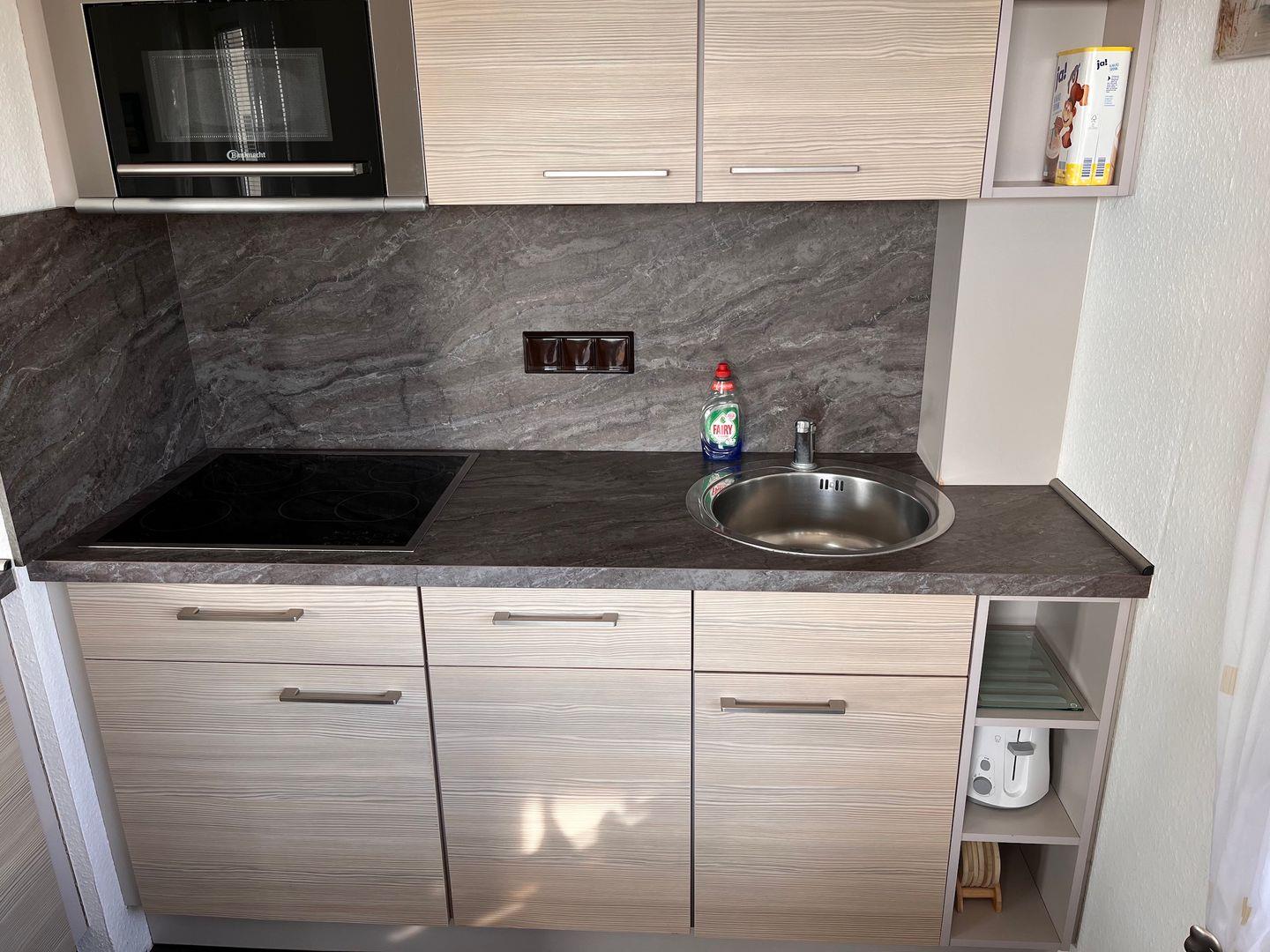 Die offen gestaltete Küche bietet alles nötige für Ihren Aufenthalt ist, auch eine Spülmaschine ist vorhanden.