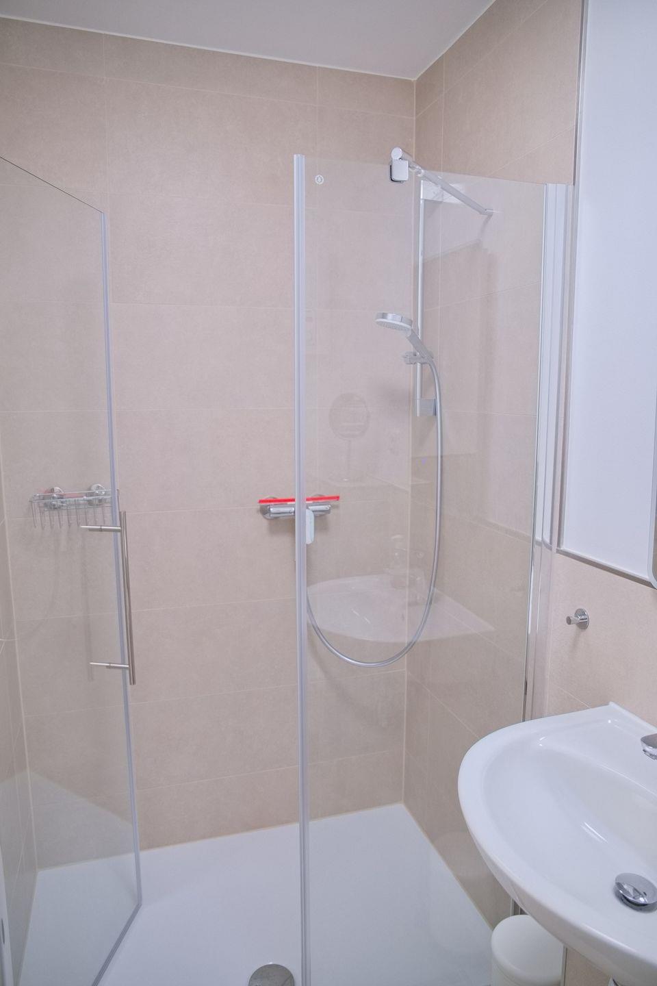 Das Schlafzimmer bietet ein bequemes Doppelbett (2x80x200 cm) und einen geräumigen Kleiderschrank. Das Badezimmer ist mit einer erfrischenden Dusche, WC und einem praktischen Spiegelschrank ausgestattet.