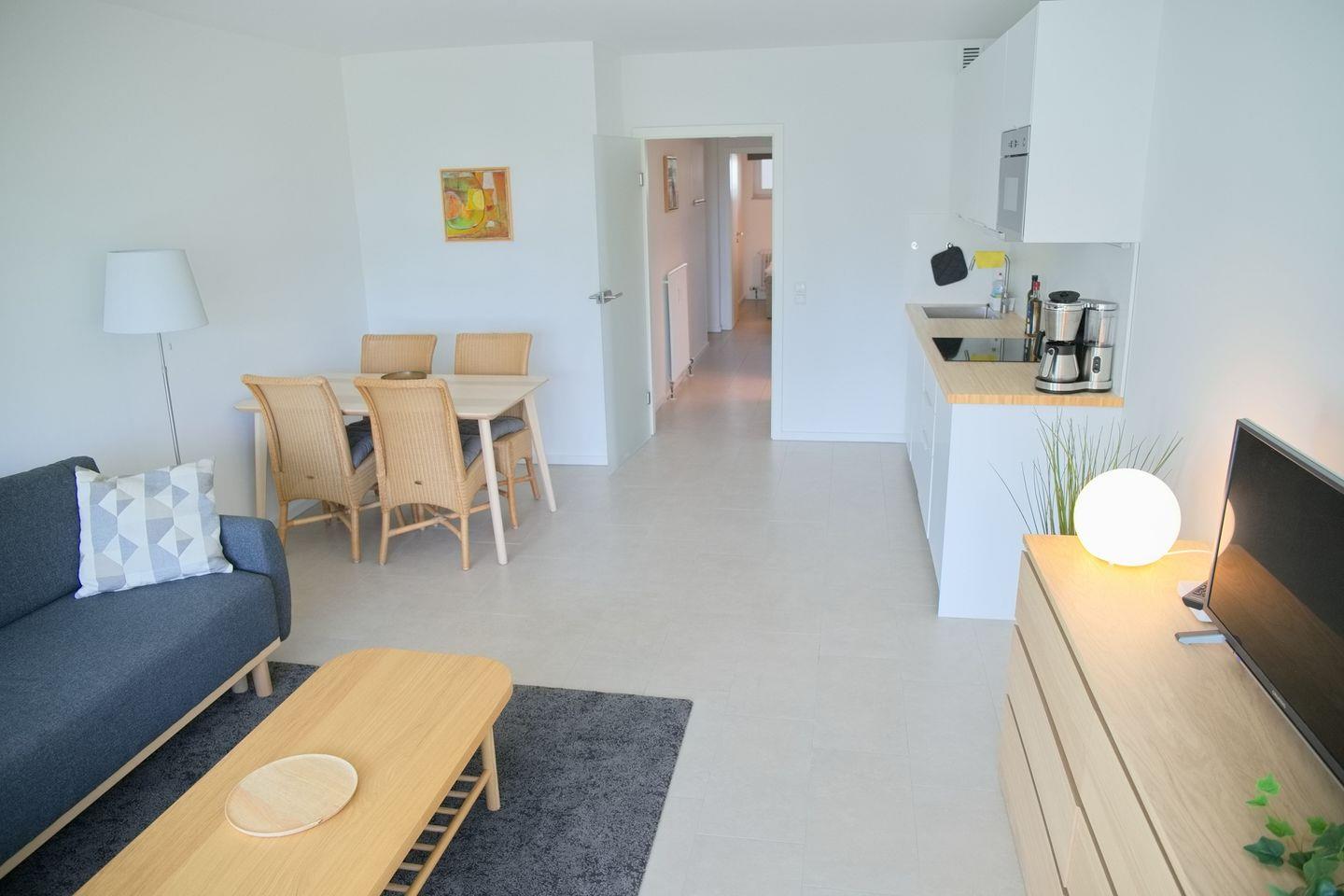 Im Wohnzimmer erwartet Sie eine einfache Schlafcouch (140x200cm) und ein Flachbild-TV. Der Essbereich mit vier Stühlen lädt zu gemeinsamen Mahlzeiten ein. Die offene Küche ist zweckmäßig ausgestattet mit Cerankochfeld, Mikrowelle, Kühlschrank mit Gefrierfach, Spülmaschine, Wasserkocher, Toaster und Kaffeemaschine.