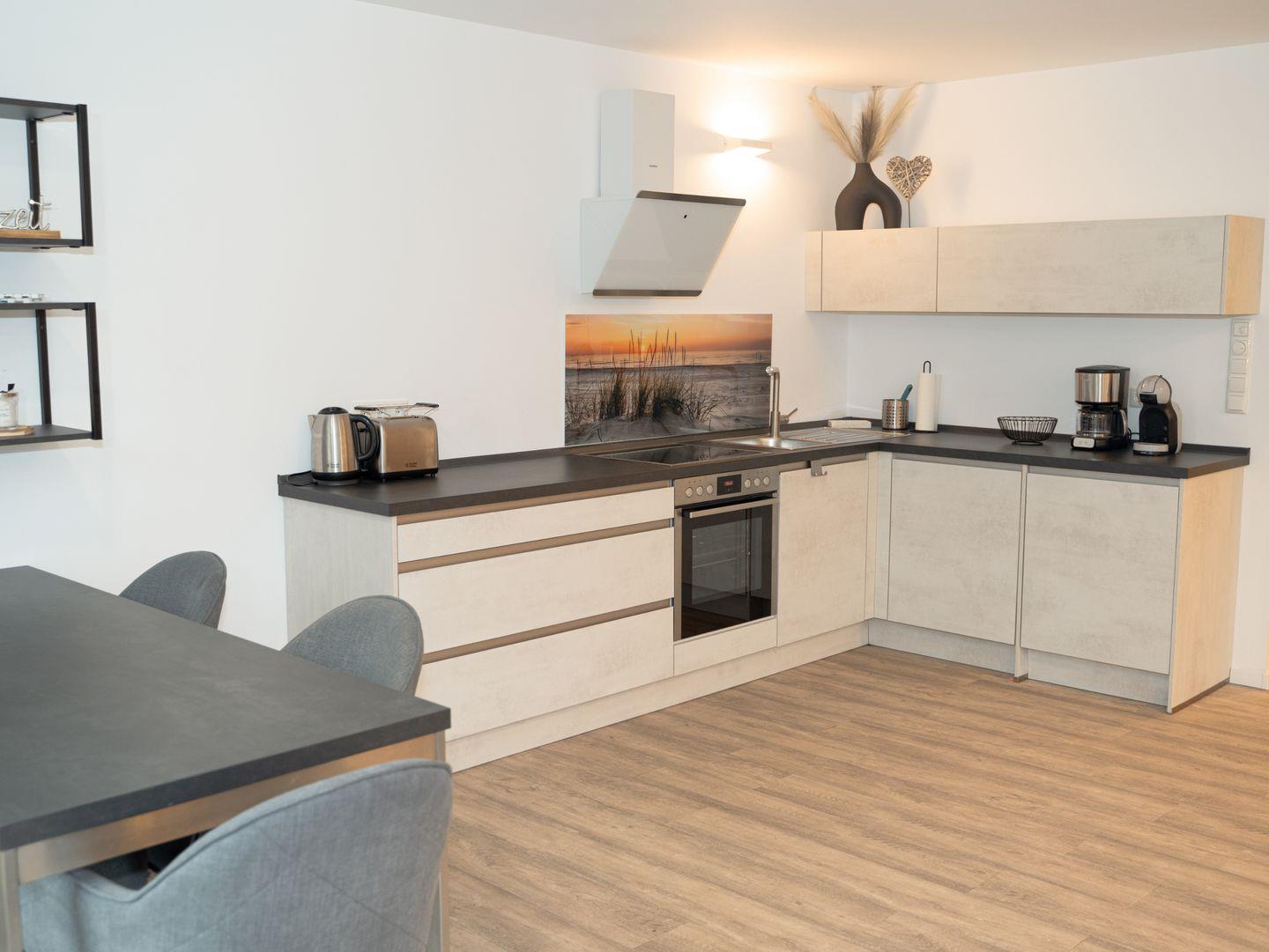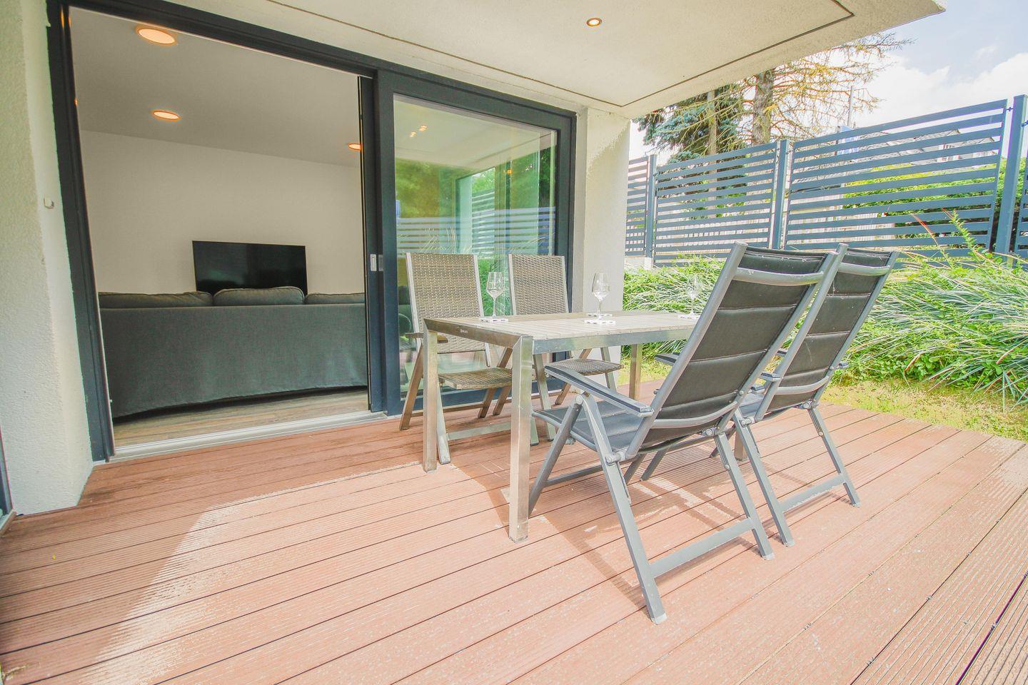 Gemütliche 76m² haustierfreundliche Ferienwohnung mit möblierter Terrasse, zwei Schlafzimmern, offenem Wohn- und Essbereich mit voll ausgestatteter Küchenzeile sowie modernem Bad mit ebenerdiger Dusche – ideal für einen entspannten Urlaub in stilvollem Ambiente für fünf Personen.