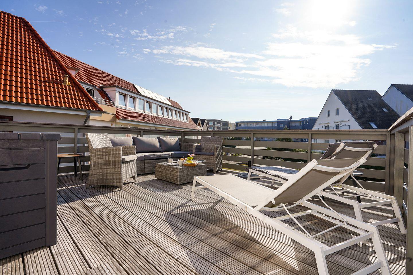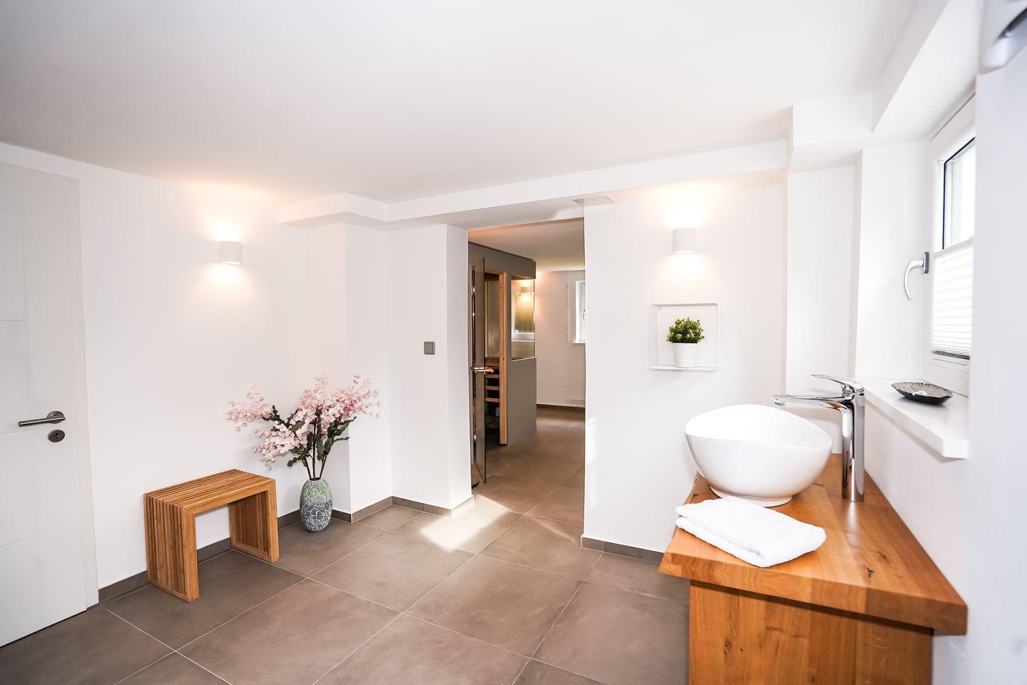 Genießen Sie Ihren eigenen Sauna- & Fitnessbereich im 45 m² großen Souterrain. Entspannung finden Sie auf der sonnengefluteten Dachterrasse oder im Strandkorb im Garten.