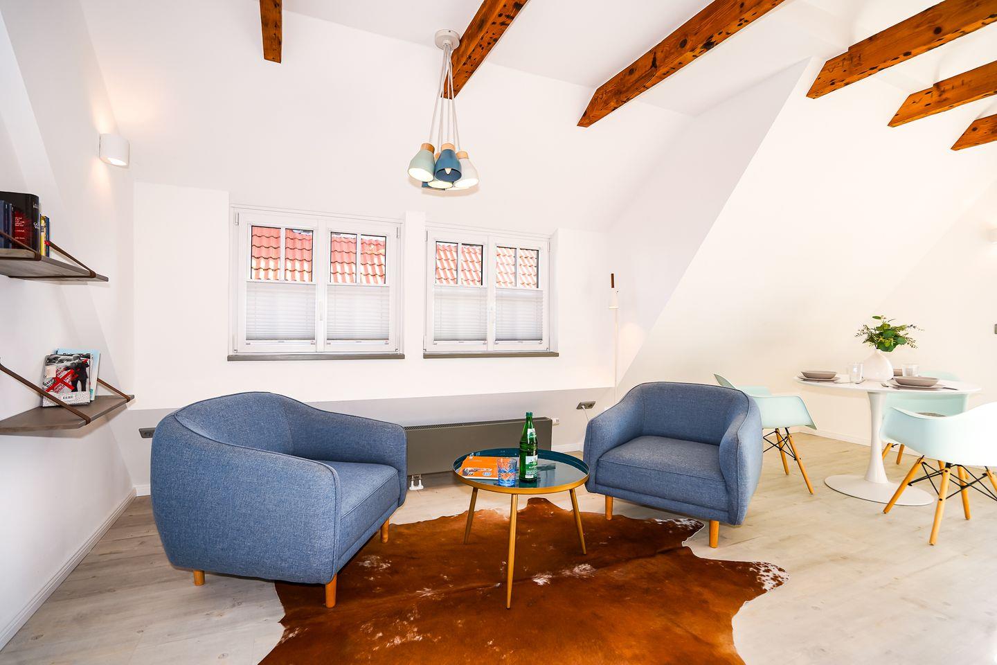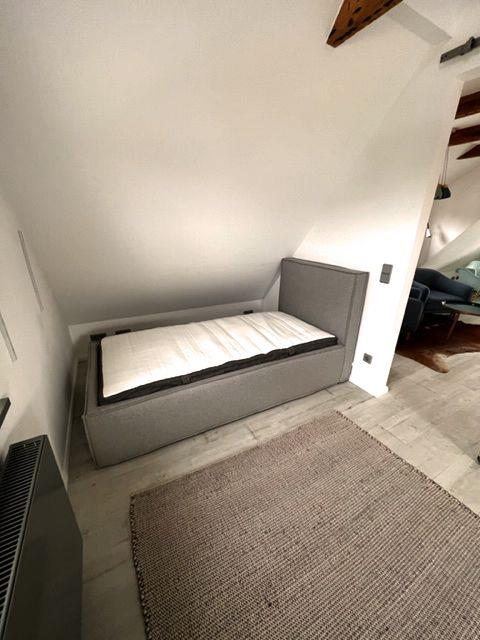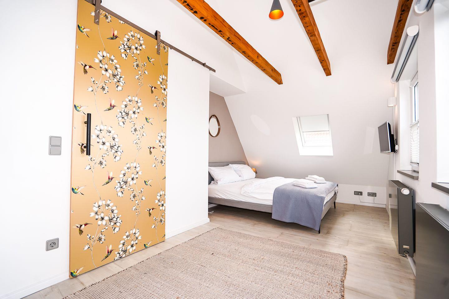 Zwei vollwertige Schlafzimmer (eins mit Doppelbett, eins im Dachgeschoss mit Doppelbett + Einzelbett) und ein dazugehöriges Vollbad schaffen Privatsphäre, dazu gibt es ein weiteres Duschbad mit WC.