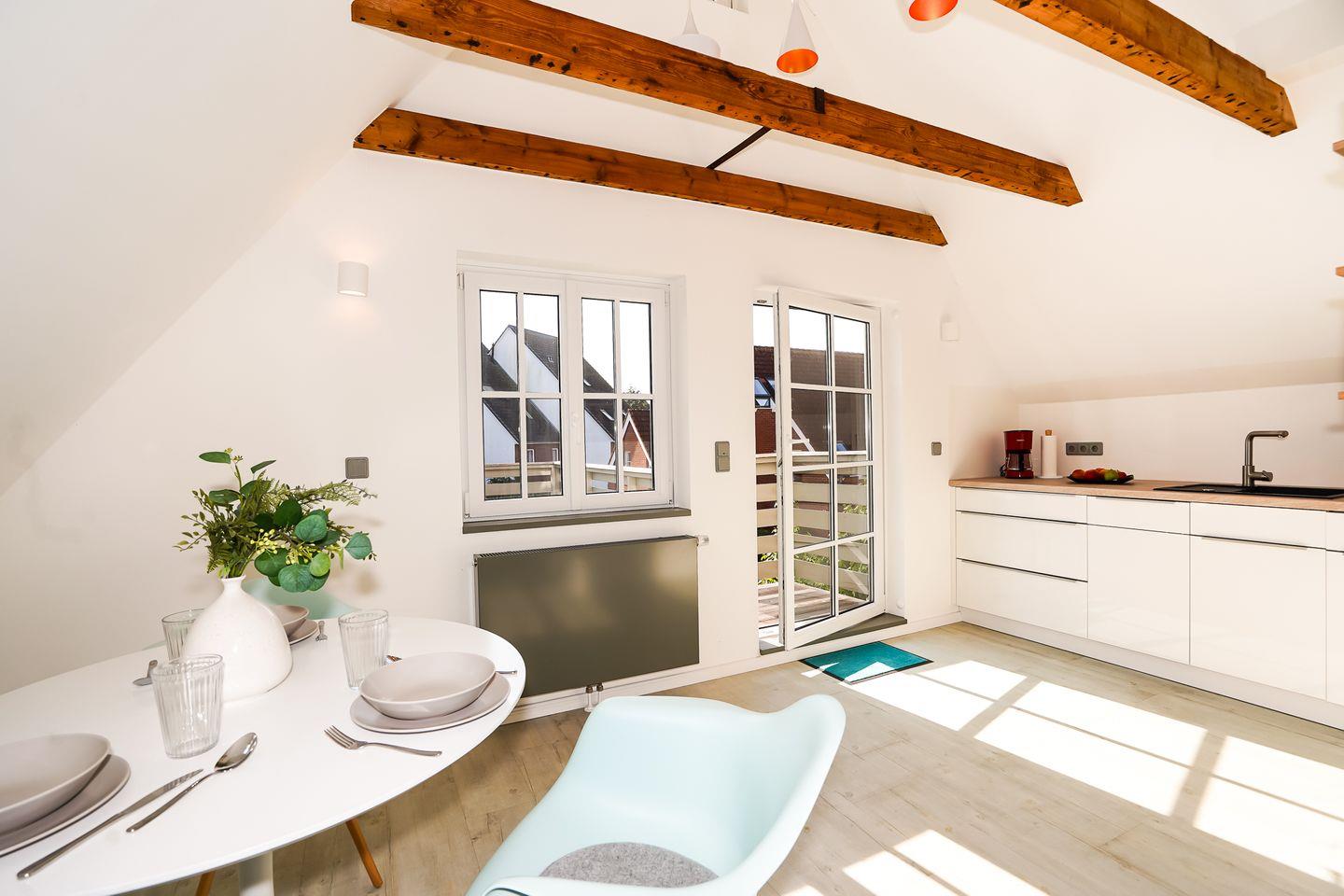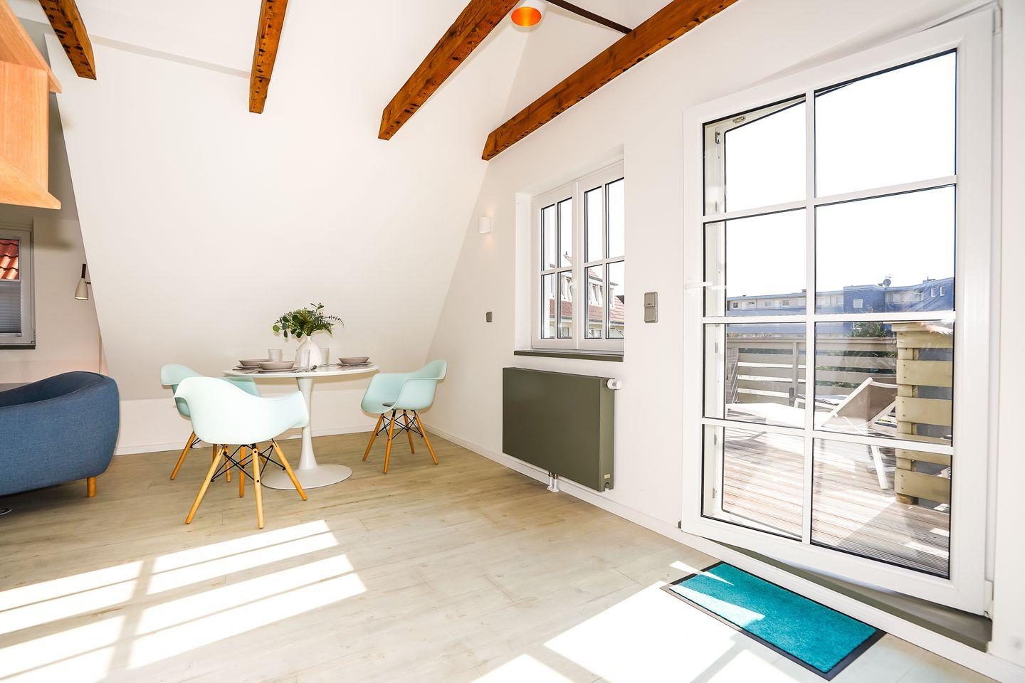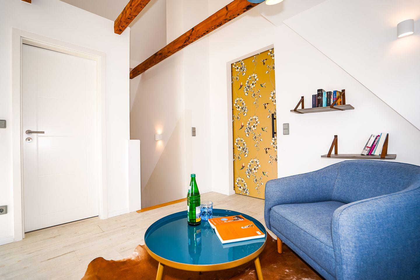 Zwei vollwertige Schlafzimmer (eins mit Doppelbett, eins im Dachgeschoss mit Doppelbett + Einzelbett) und ein dazugehöriges Vollbad schaffen Privatsphäre, dazu gibt es ein weiteres Duschbad mit WC.