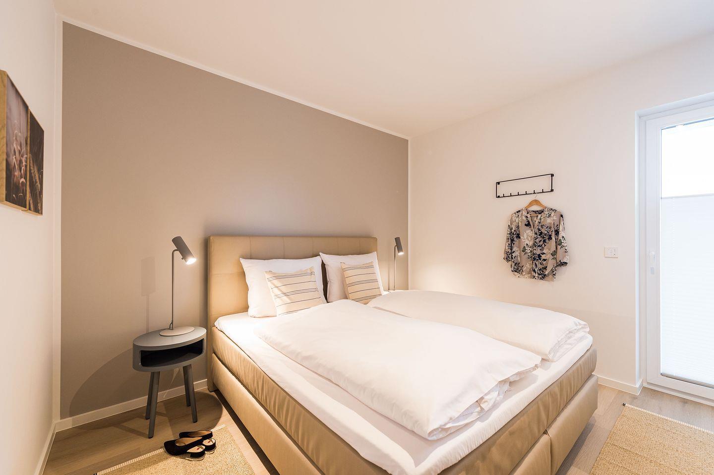 Sie ist für bis zu 6 Personen (der angegebene Preis bezieht sich immer auf 2 Erwachsene und 2 Kinder, extra Personen können ggf. auf Anfrage dazu gebucht werden) buchbar (2 Schlafzimmer mit Doppelbetten 180 x 200 cm, 1 Schlafzimmer mit Doppelbett 140 x 200 cm) und verfügt über eine gehobene 5-Sterne-Ausstattung: 2 Badezimmer, 1 Sauna, 1 Whirlwanne sowie 1 Terrasse. Die Küche ist komplett ausgestattet und bietet einen großen Esstisch für bis zu 6 Personen. Zudem gibt es einen Geschirrspüler, einen Kühlschrank inkl. Gefrierfach, eine Mikrowelle sowie einen Waschtrockner. Im Wohnbereich erwartet Sie ein 55-Zoll-Smart-TV sowie der Zugang zur großzügigen Terrasse. Die Terrasse ist ebenfalls mit einem großen Esstisch ausgestattet. Selbstverständlich bieten wir schnelles und kostenfreies WLAN sowie einen PKW-Stellplatz direkt am Haus. Auf den hauseigenen Parkplätzen stehen Ihnen E-Auto-Ladegeräte (Wallboxen) zur Verfügung (gegen Gebühr). Aufgrund der Allergiker gerechten Ausstattung sind Haustiere nicht erlaubt.