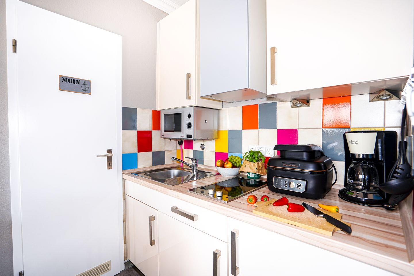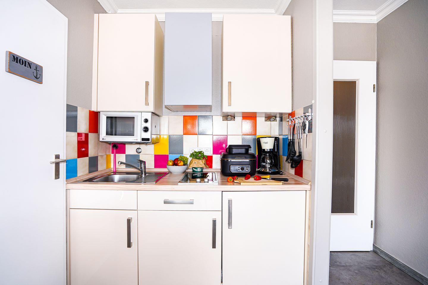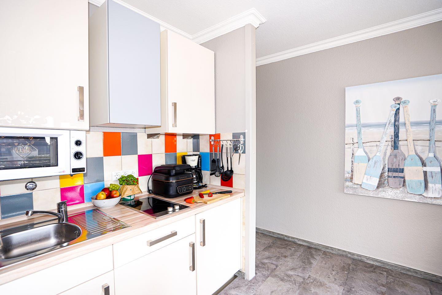 Die Küchenzeile ist mit Ceranfeld, Mikrowelle, Kühlschrank mit Gefrierfach, Kaffeemaschine und Wasserkocher ausgestattet.