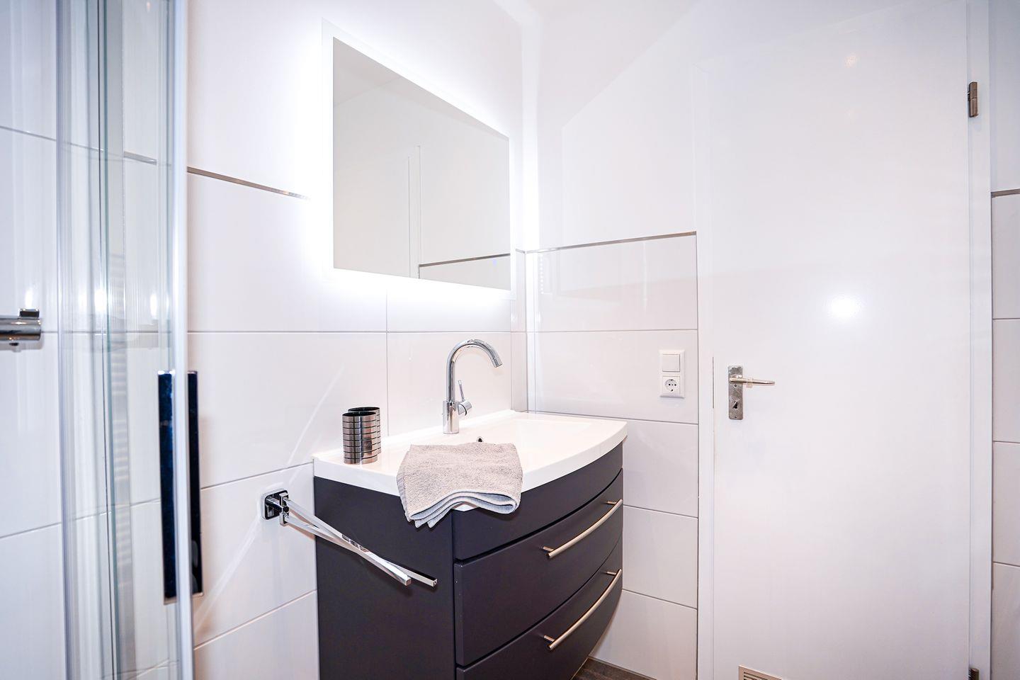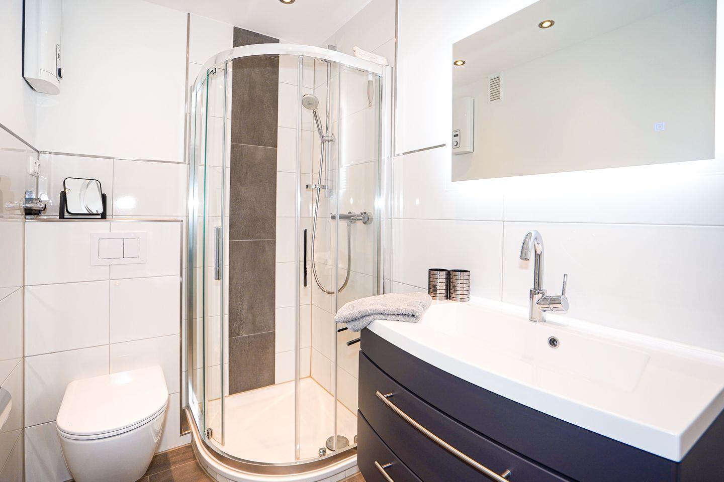 Das Bad besteht aus einer Runddusche, WC und Waschtisch mit beleuchtetem Spiegel.