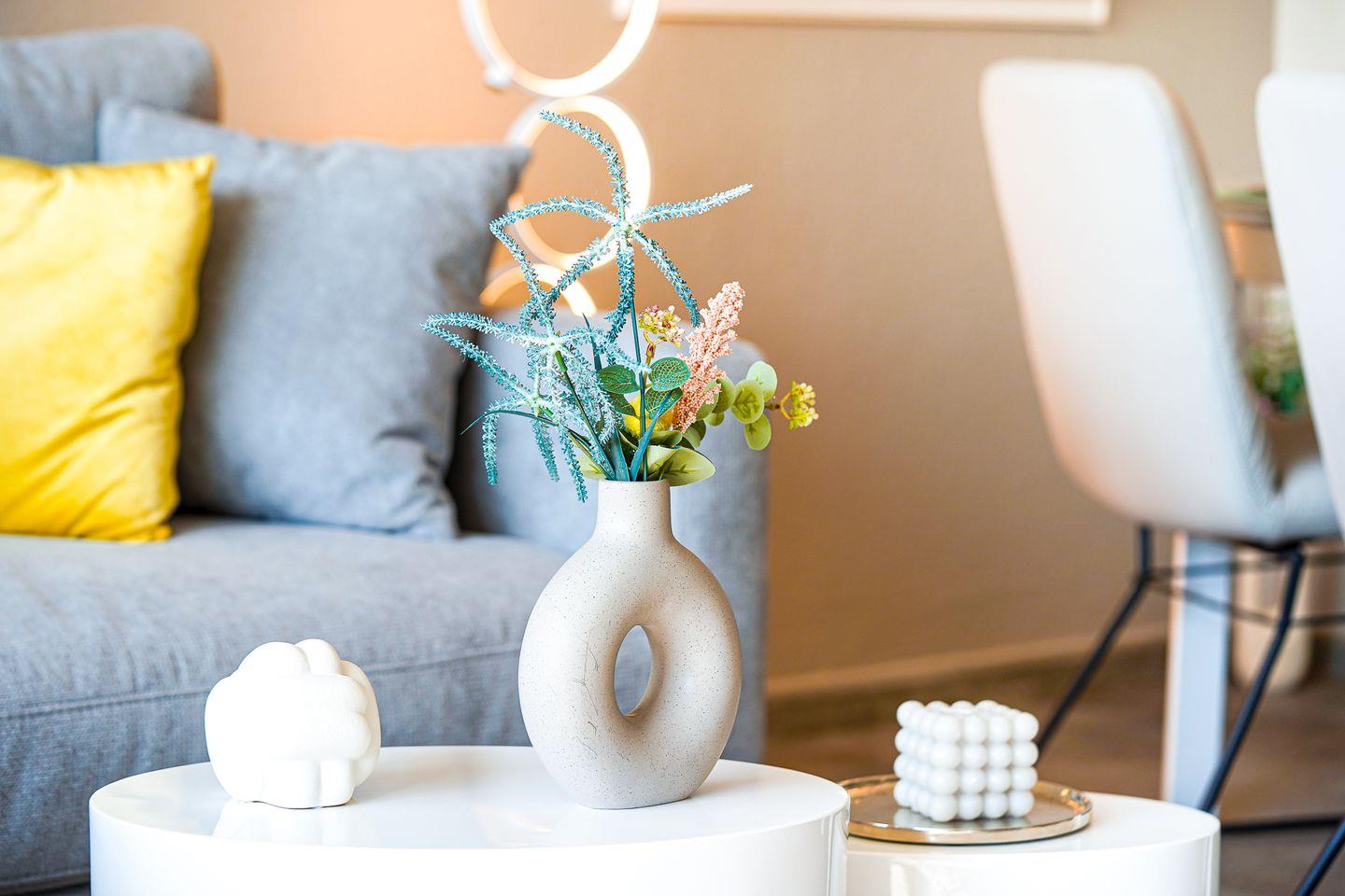 Die Wohnfläche verteilt sich auf ein Wohnzimmer mit offener Küchenzeile und Zugang zum Südbalkon mit Markise, ein Schlafzimmer, Bad sowie Flur mit kleiner Garderobe.