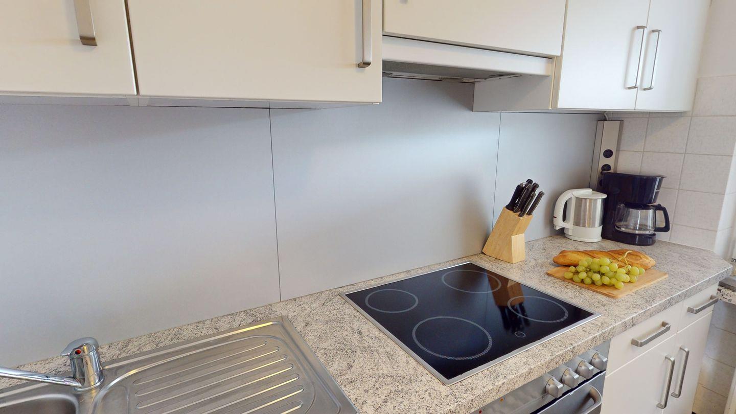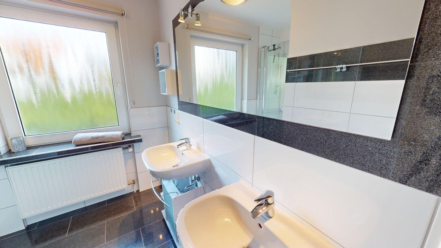 Die Wohnung teilt sich auf in ein Wohn-/Esszimmer, 2 Schlafzimmer (eins mit Doppelbett, eins mit 2 Einzelbetten), einer Küche mit Durchreiche, einem Bad mit zwei Waschbecken und einem separaten WC.