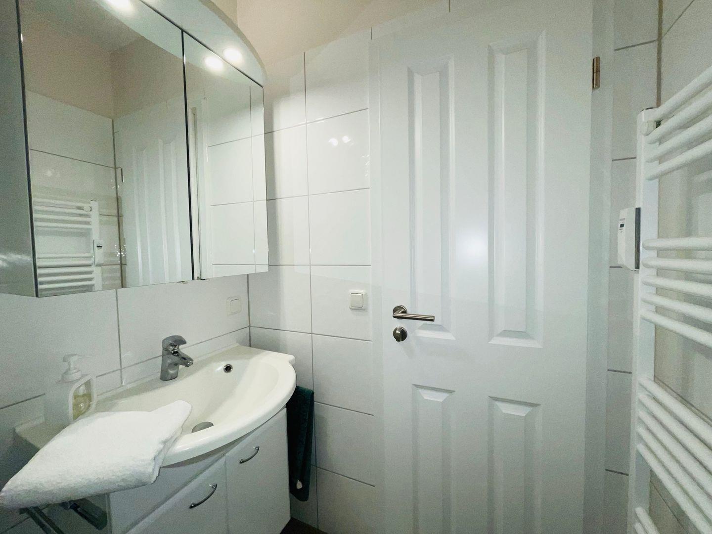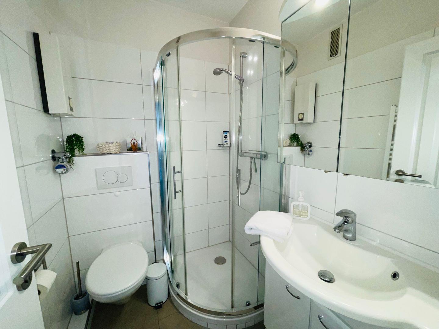 Das helle Badezimmer verfügt über eine Dusche, WC und Waschtisch, auch ein Handtuchheizkörper ist vorhanden.