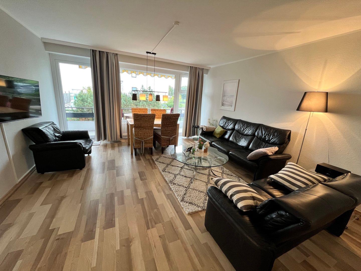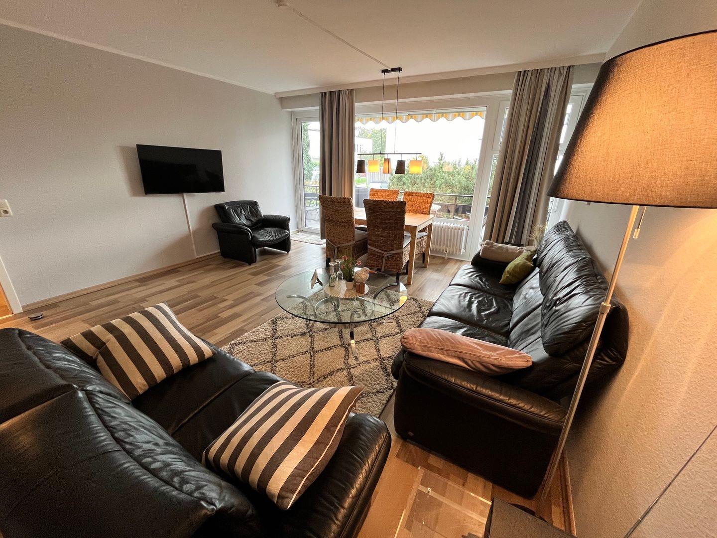 Das sonnige Wohnzimmer verfügt neben dem Essplatz und einer Sofa Ecke über ein Schrankbett (2x 90cm x 200cm) und einen Flachbildfernseher, von hier gelangen Sie auch auf den Balkon (Südlage) von dem sich auch ein kleines bisschen Ostsee erblicken lässt. Selbstverständlich steht Ihnen auch ein kostenfreier WLAN-Anschluss zur Verfügung, damit Sie auch Ihre schönsten Urlaubserlebnis mit Ihren liebsten zuhause teilen können.