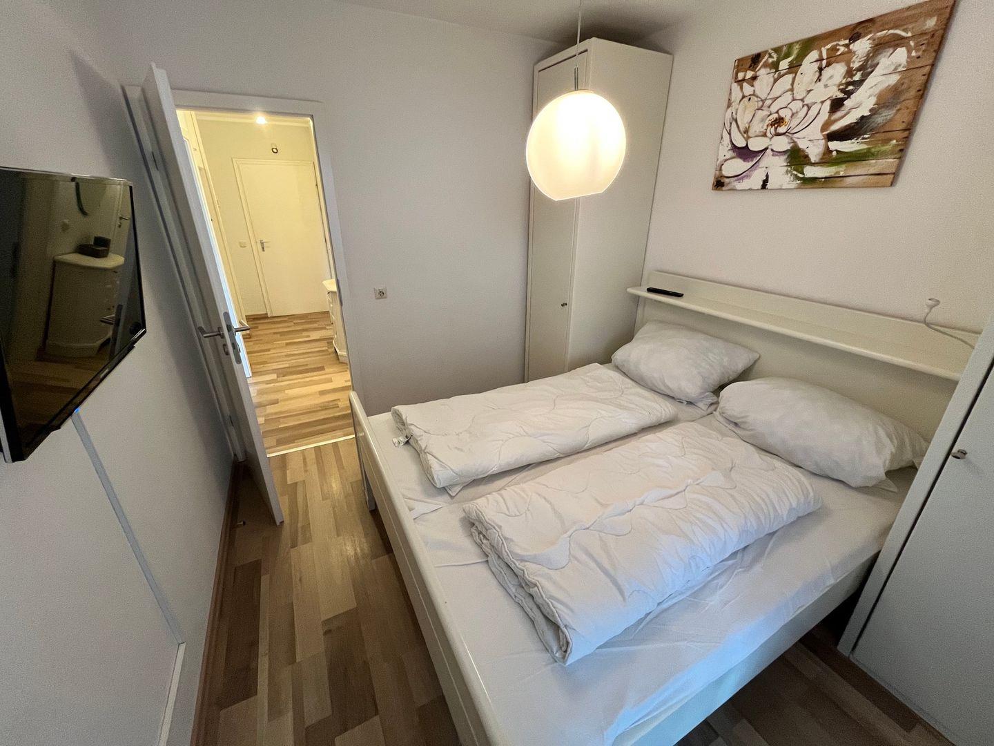 Des weiteren verfügt das neue Schlafzimmer über ein Doppelbett (Topper 180x200cm) einen Kleiderschrank und einen weiteren Flachbildfernseher.