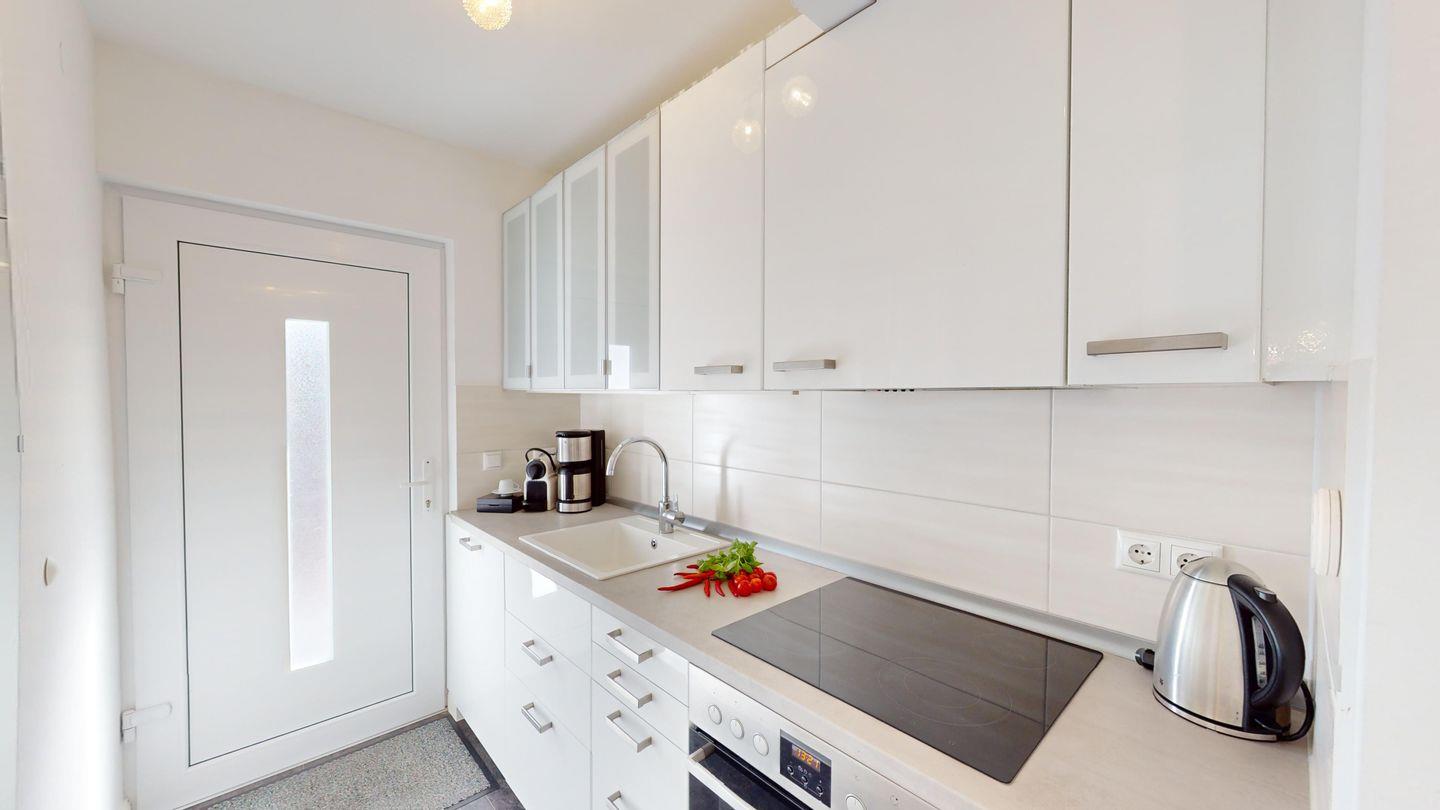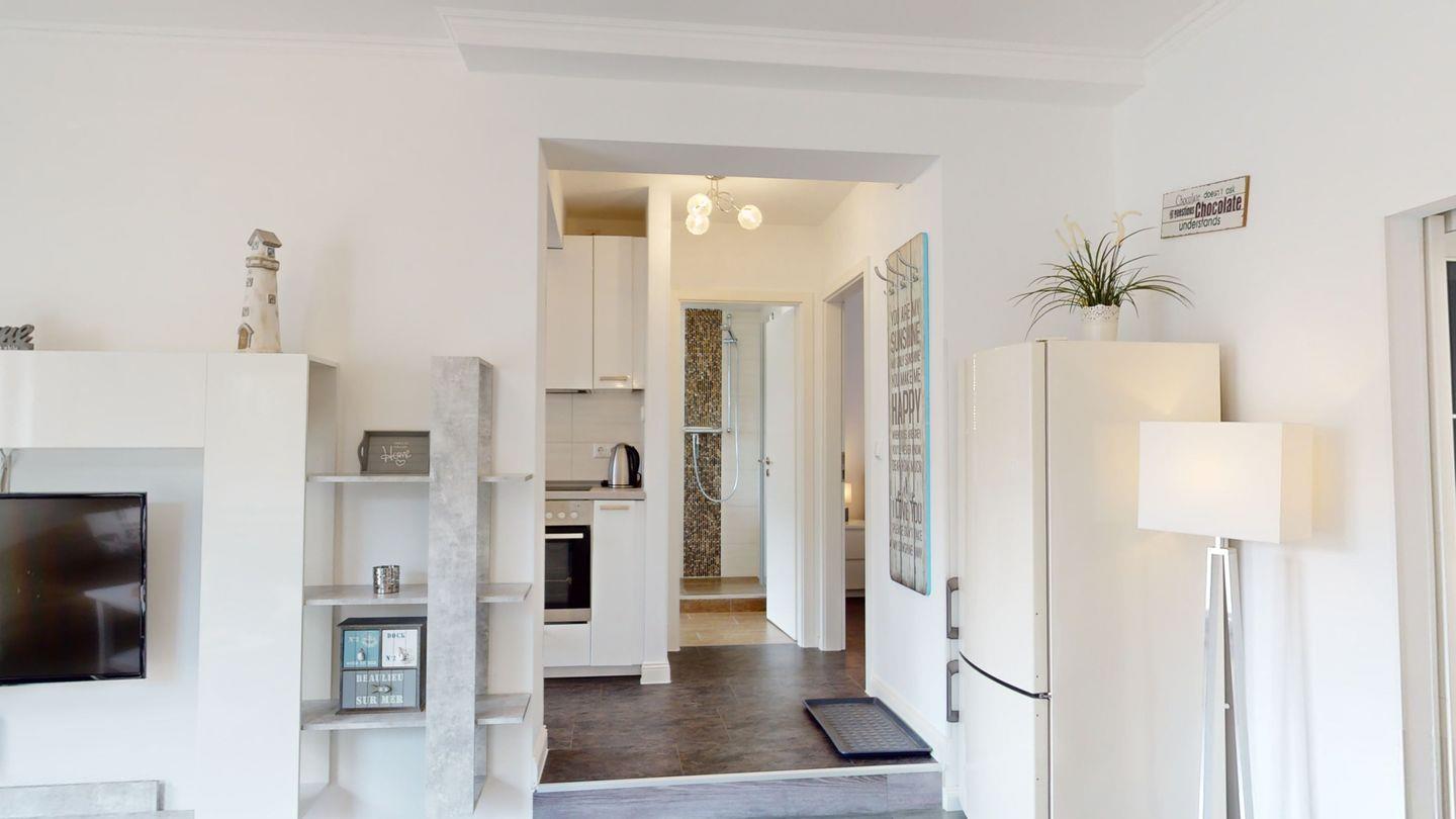 Die komplett ausgestattete, halboffene Küche schließt mit zwei Stufen an den Wohnbereich an.