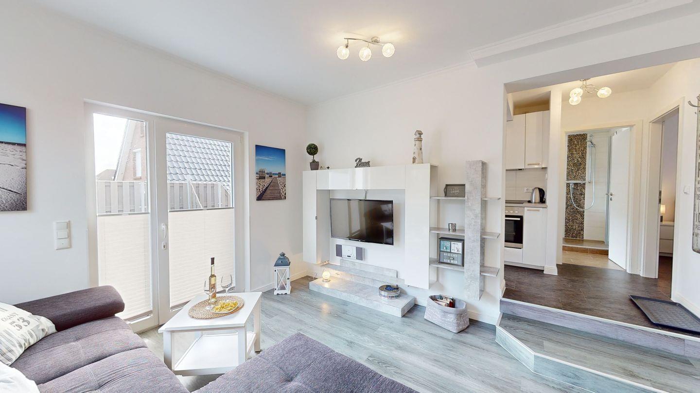 Diese gemütliche Ferienwohnung Nummer 3 "Welle" mit Terrasse liegt in der Villa Klarsinni I im hinteren Teil des Hauses im Erdgeschoss und ist ca. 58 qm groß. Zum Strand sind es nur wenige Minuten zu Fuß.