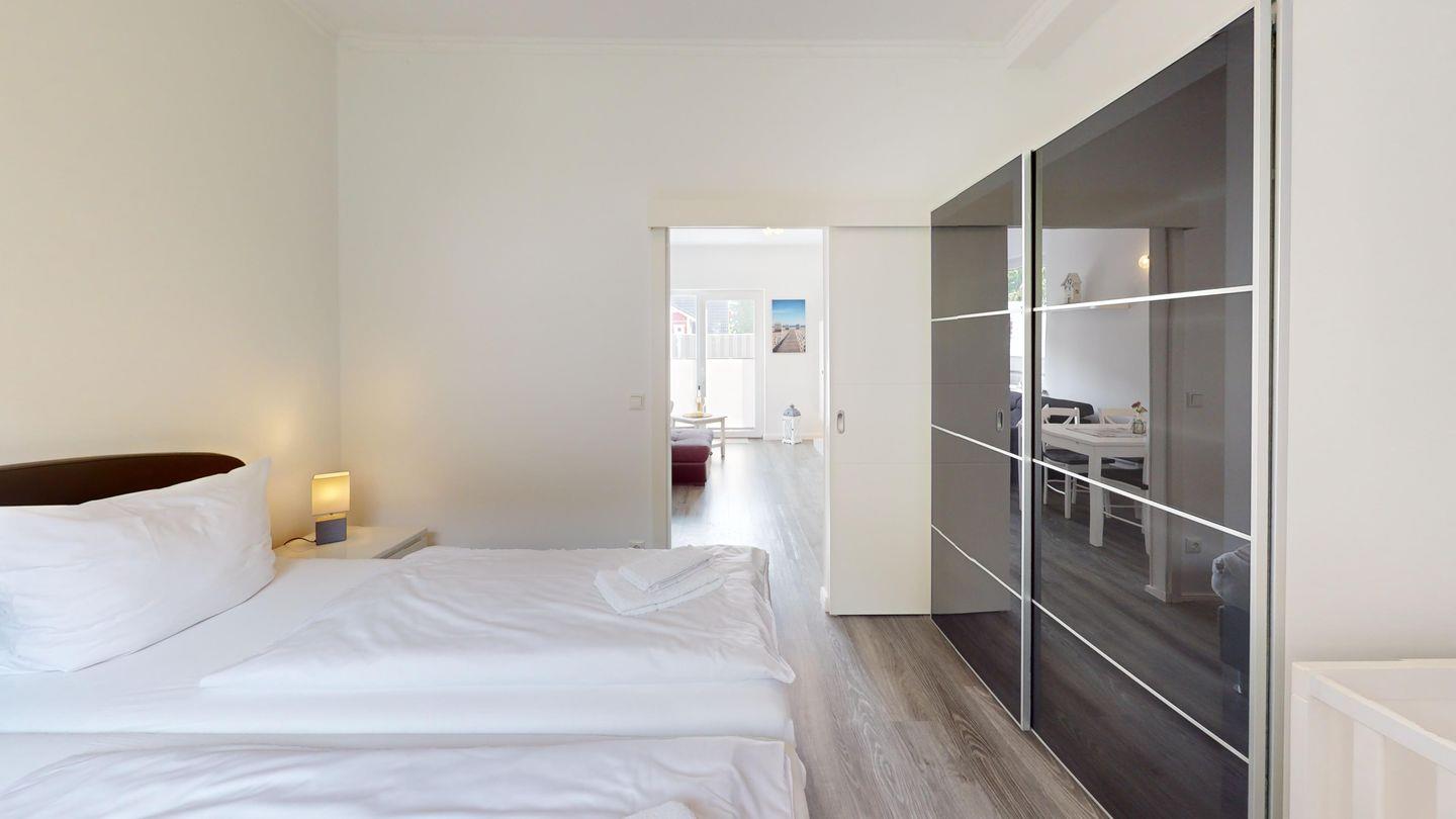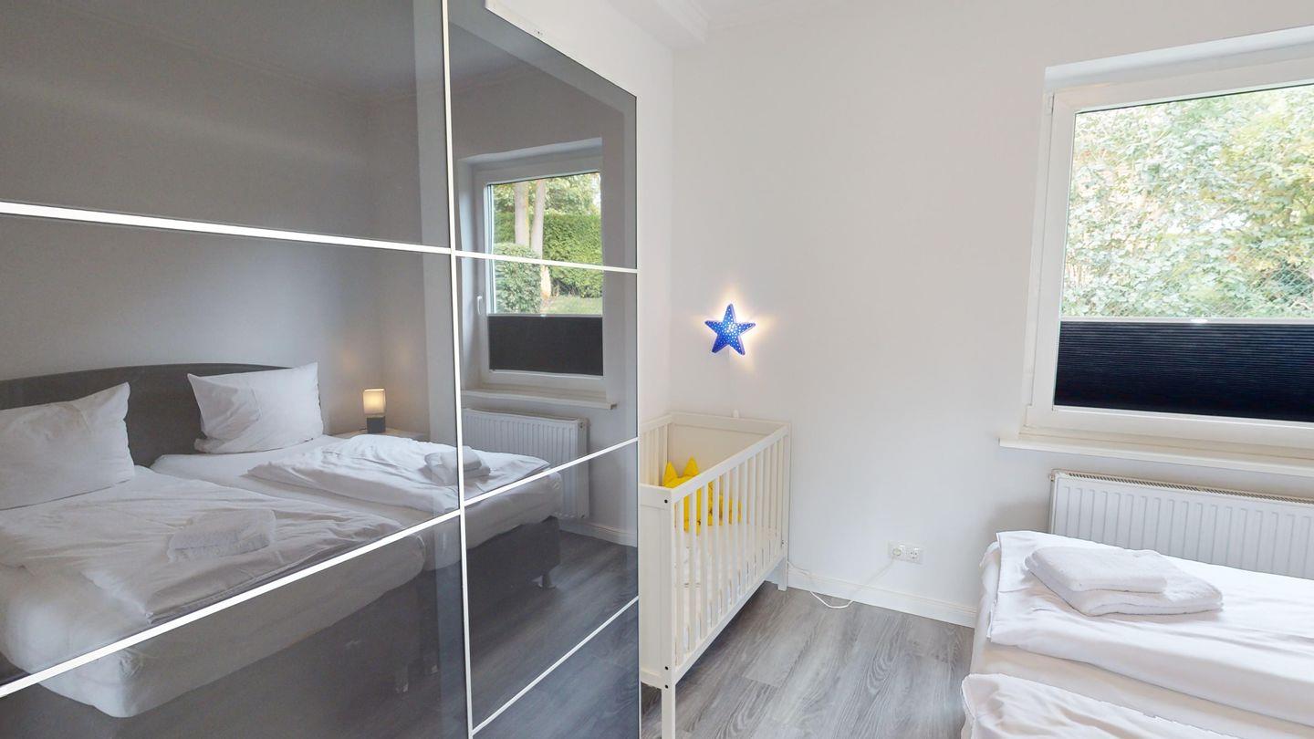 Eins der Schlafzimmer grenzt an den Wohnbereich an und hat zusätzlich ein hochwertiges Holz-Babybett (60 x 120 cm).