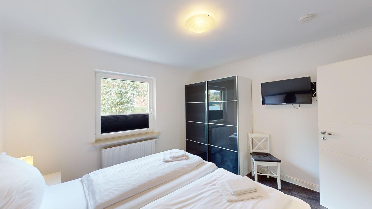 Das zweite Schlafzimmer befindet sich zwei Stufen erhöht auf einer Ebene mit dem Bad und der Küche und hat zusätzlich einen Fernseher. Einen weiteren Schlafplatz bietet die Schlafcouch im Wohnzimmer.
