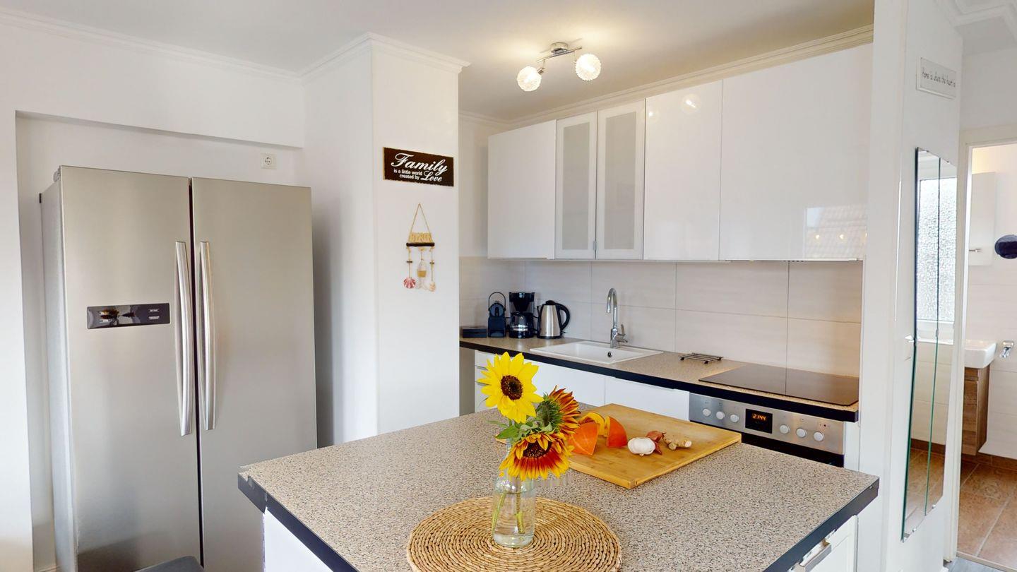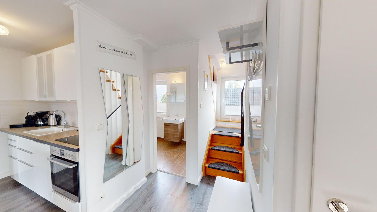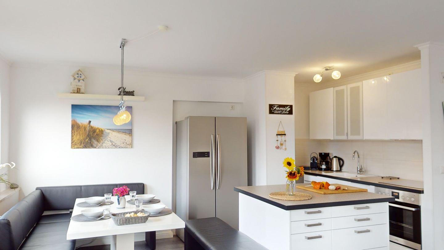 Die Küche ist im Wohnzimmer als offene Wohnküche integriert und vollständig ausgestattet.
