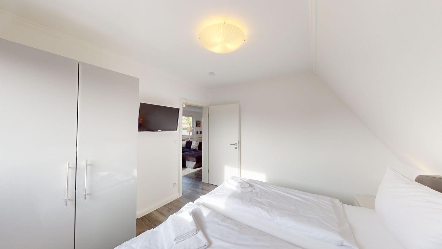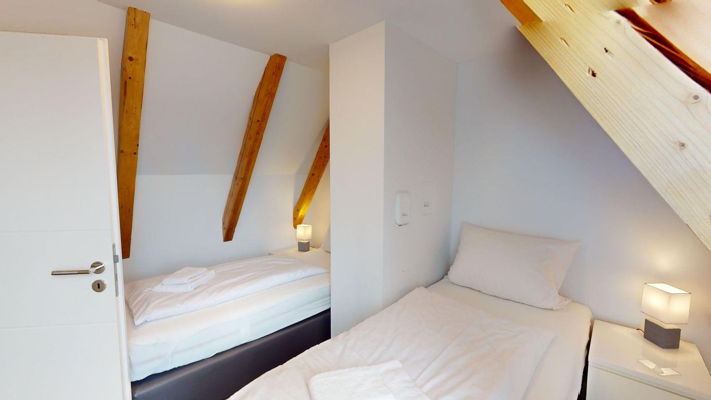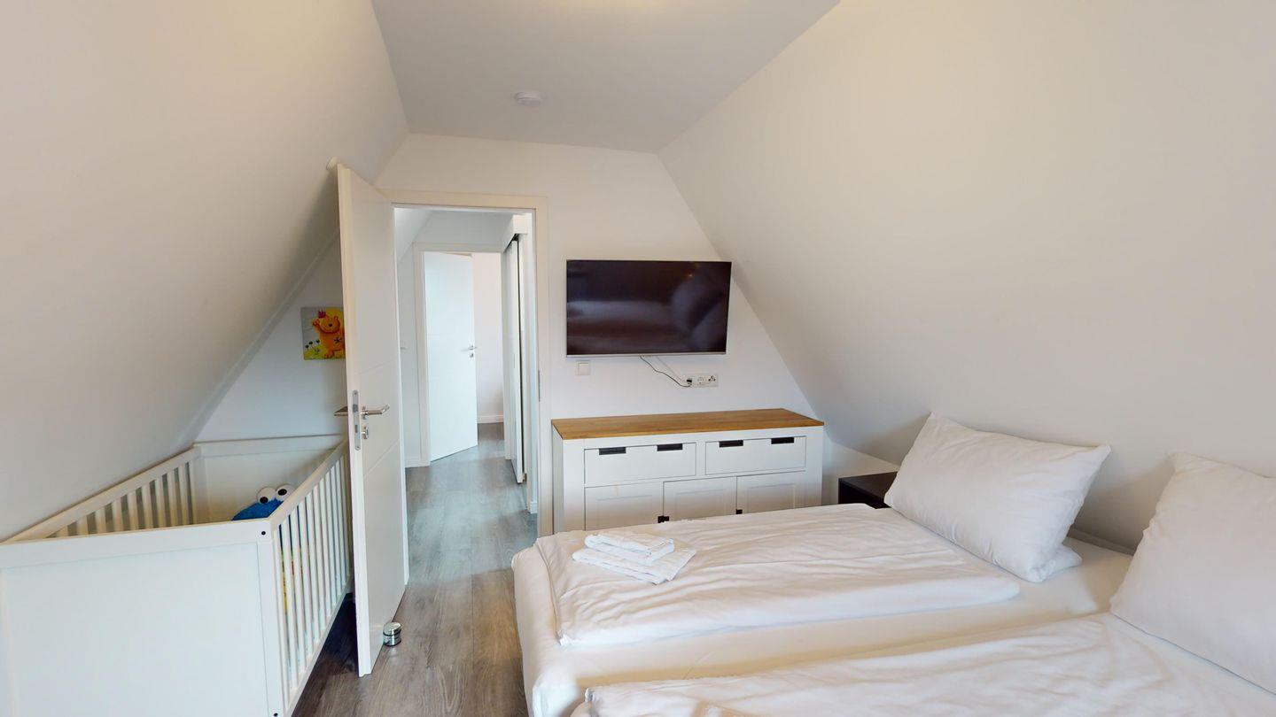 Im Dachgeschoss ist ein weiteres Schlafzimmer mit Doppelbett, Fernseher und zusätzlich einem Holz-Babybett (60 x 120 cm) sowie das vierte Schlafzimmer mit zwei getrennt stehenden Betten und Fernseher.