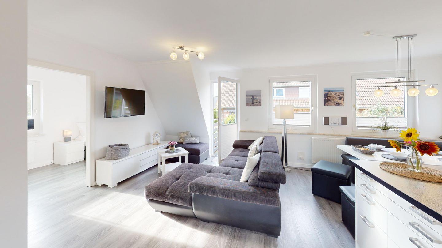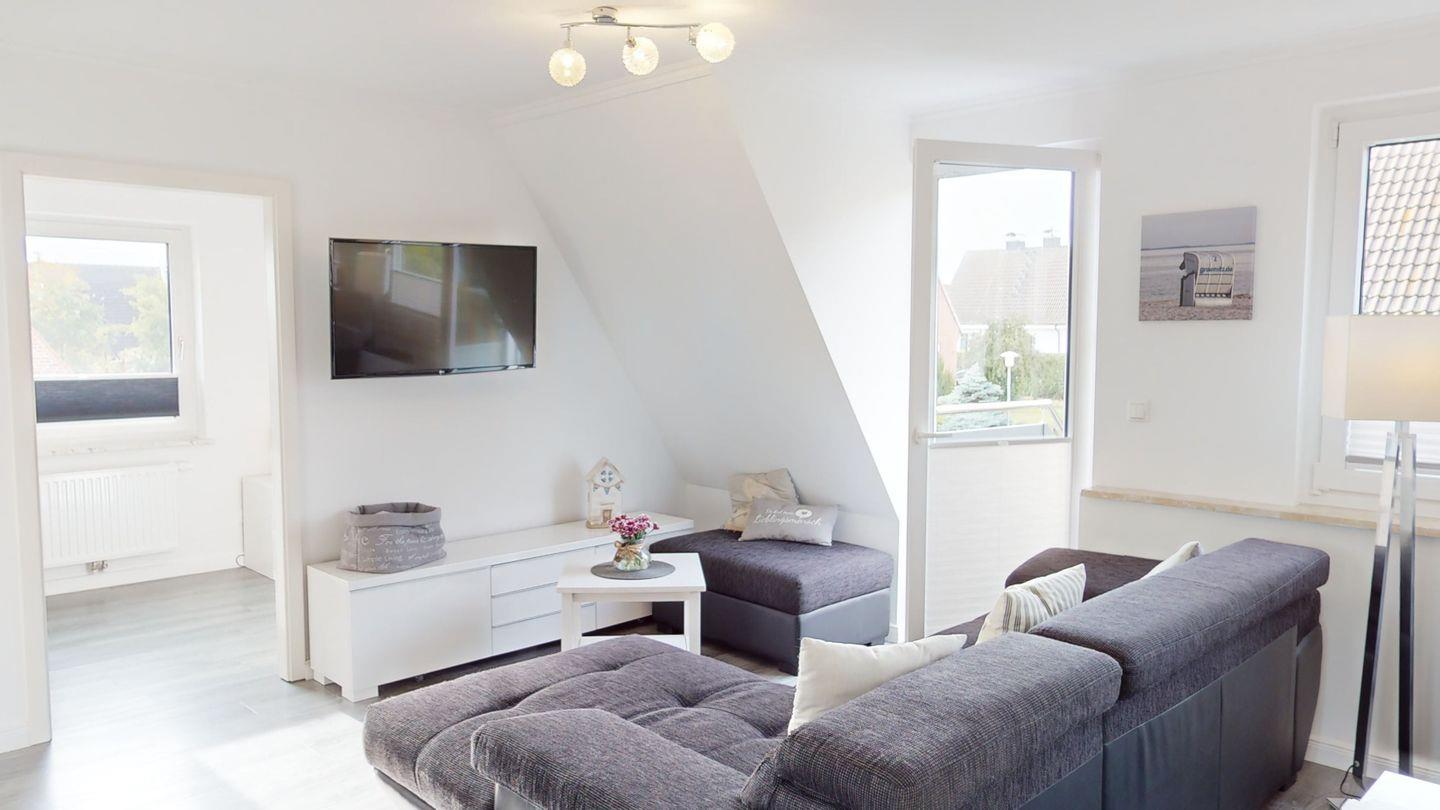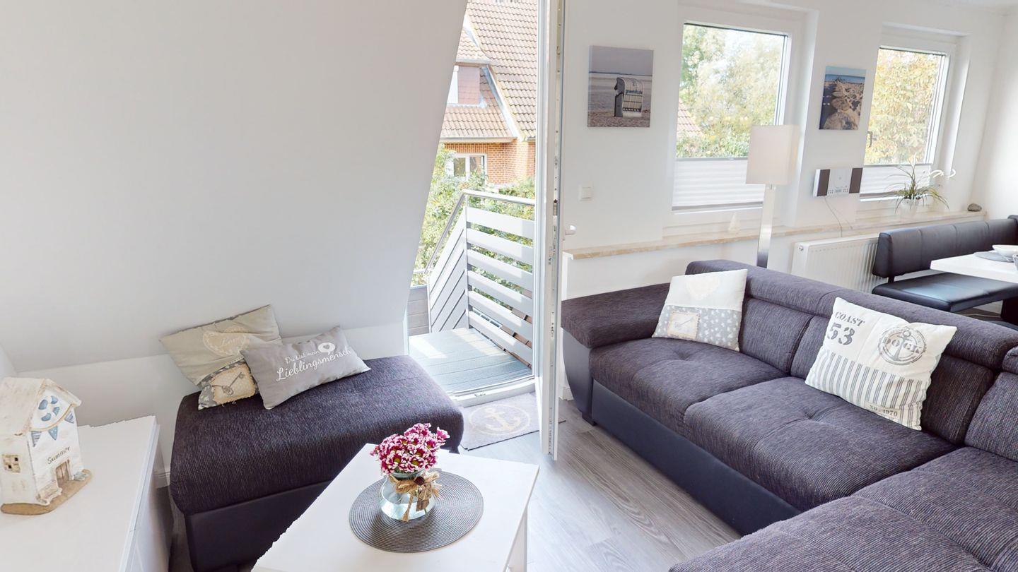 Die große, aufwändig renovierte Wohnung 2 "Strandkorb" liegt im Vorderhaus der Villa Klarsinni I und erstreckt sich über 2 Ebenen (1. Stock und Dachgeschoss). Bis zu 7 Gäste + Hund finden hier auf 74 qm Platz. Zum Strand sind es nur wenige Minuten zu Fuß.