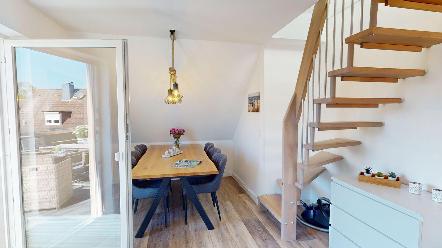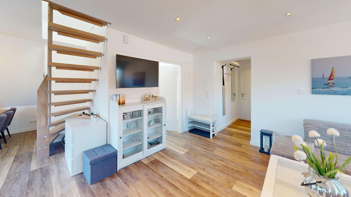 Die Luxus-Ferienwohnung "Muschel" in der Villa Klarsinni II liegt im 1. Stock des Hauses, geht über zwei Etagen und ist hochwertig möbliert. Sie liegt parallel zur Wohnung "Krabbe" und es bietet sich an, bei mehr als sechs Personen beide Wohnungen zu buchen.