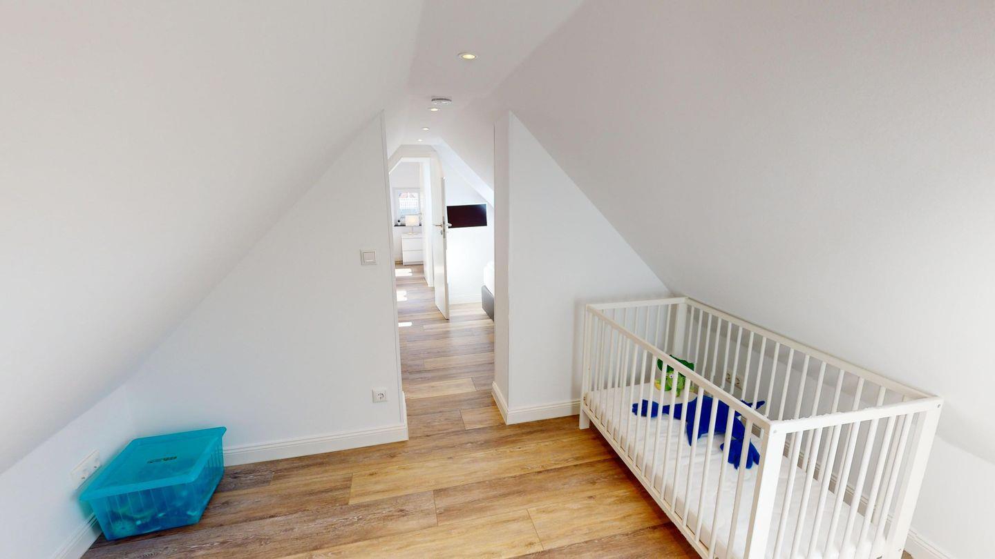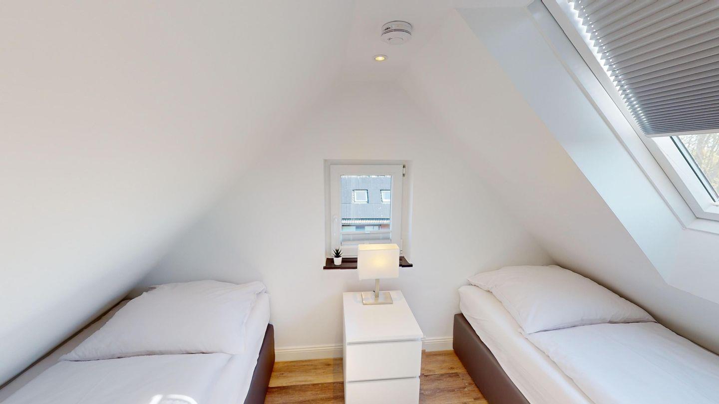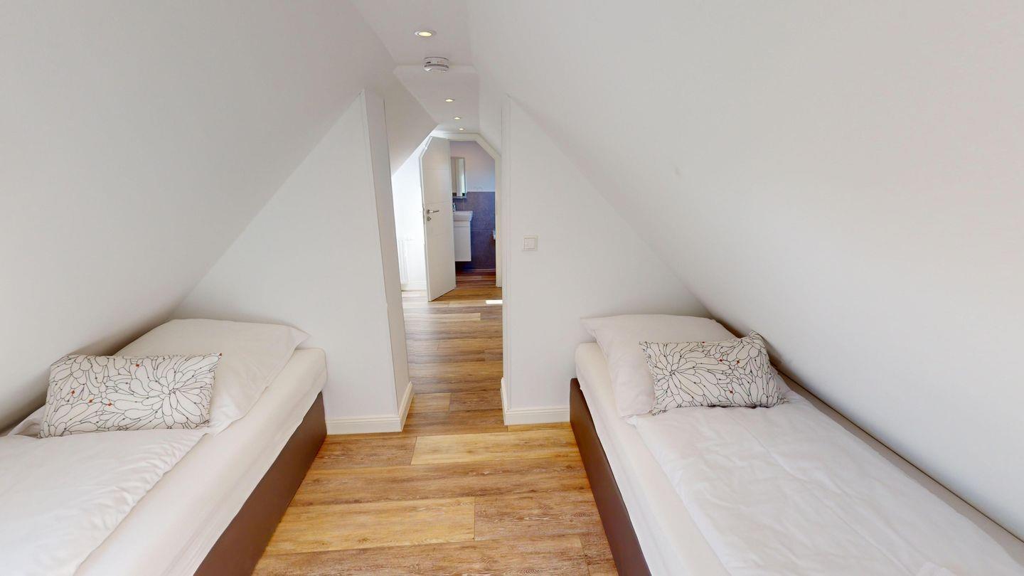 In der oberen Etage der Wohnung befinden sich zwei Schlafzimmer, jeweils mit zwei Einzelbetten ausgestattet, die insgesamt vier Schlafmöglichkeiten bieten. In einem Zimmer befindet sich zusätzlich ein Holz-Kinderbett (60 x 120 cm). Das dritte Schlafzimmer mit Doppelbett befindet sich auf der Wohnebene.
