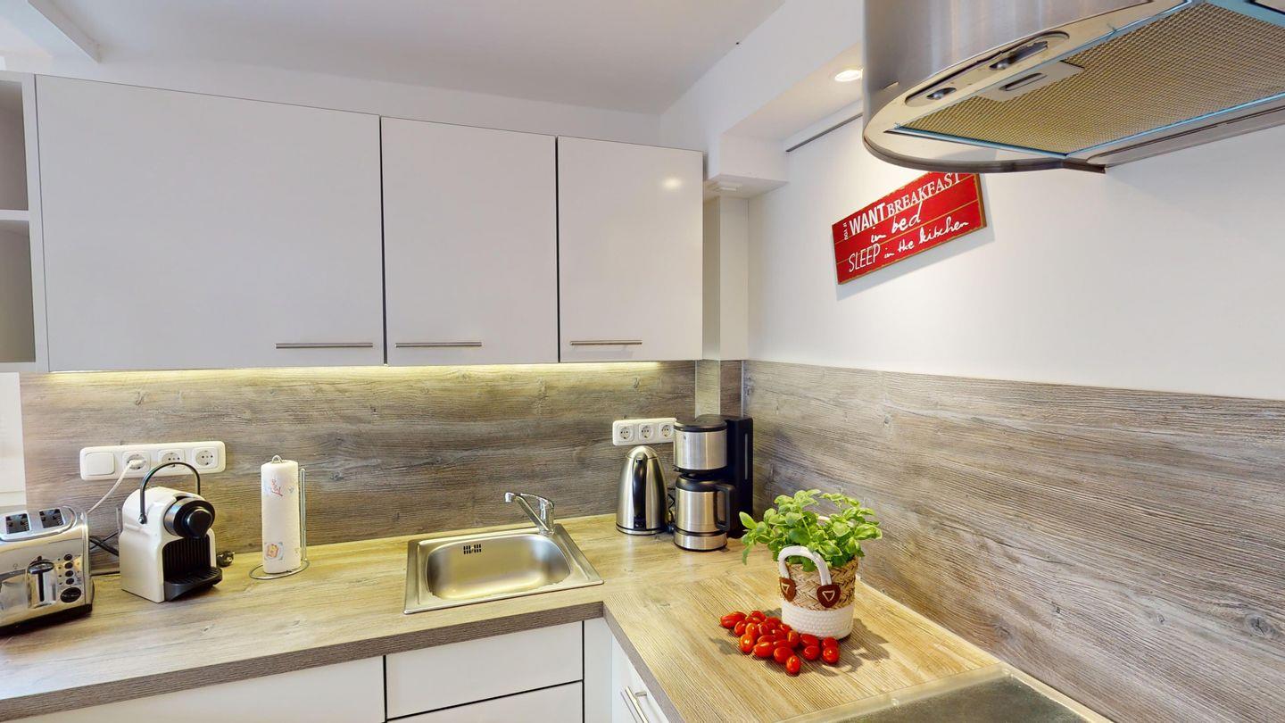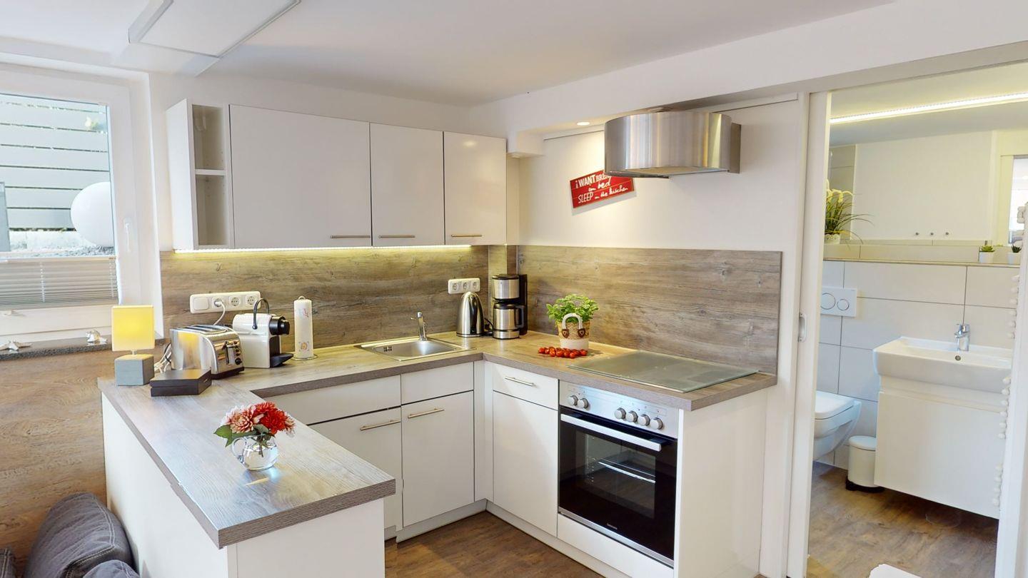 Die kompakte Ferienwohnung liegt im Erdgeschoss und bietet mit einer komfortablen Schlafcouch, einer voll eingerichteten Küche sowie einem Duschbad und einem begehbaren Kleiderschrank allen Komfort für Ihren Urlaub.
