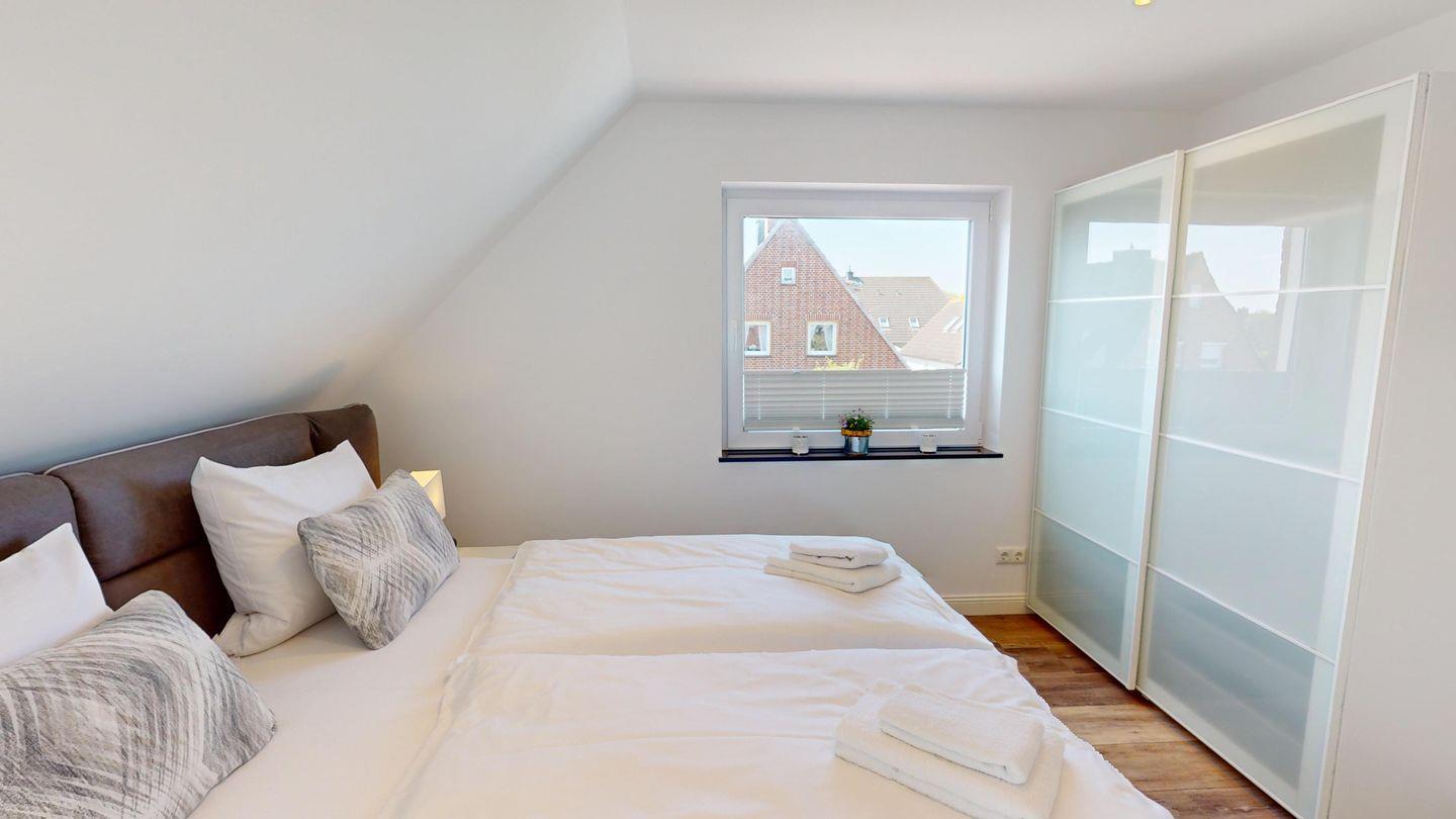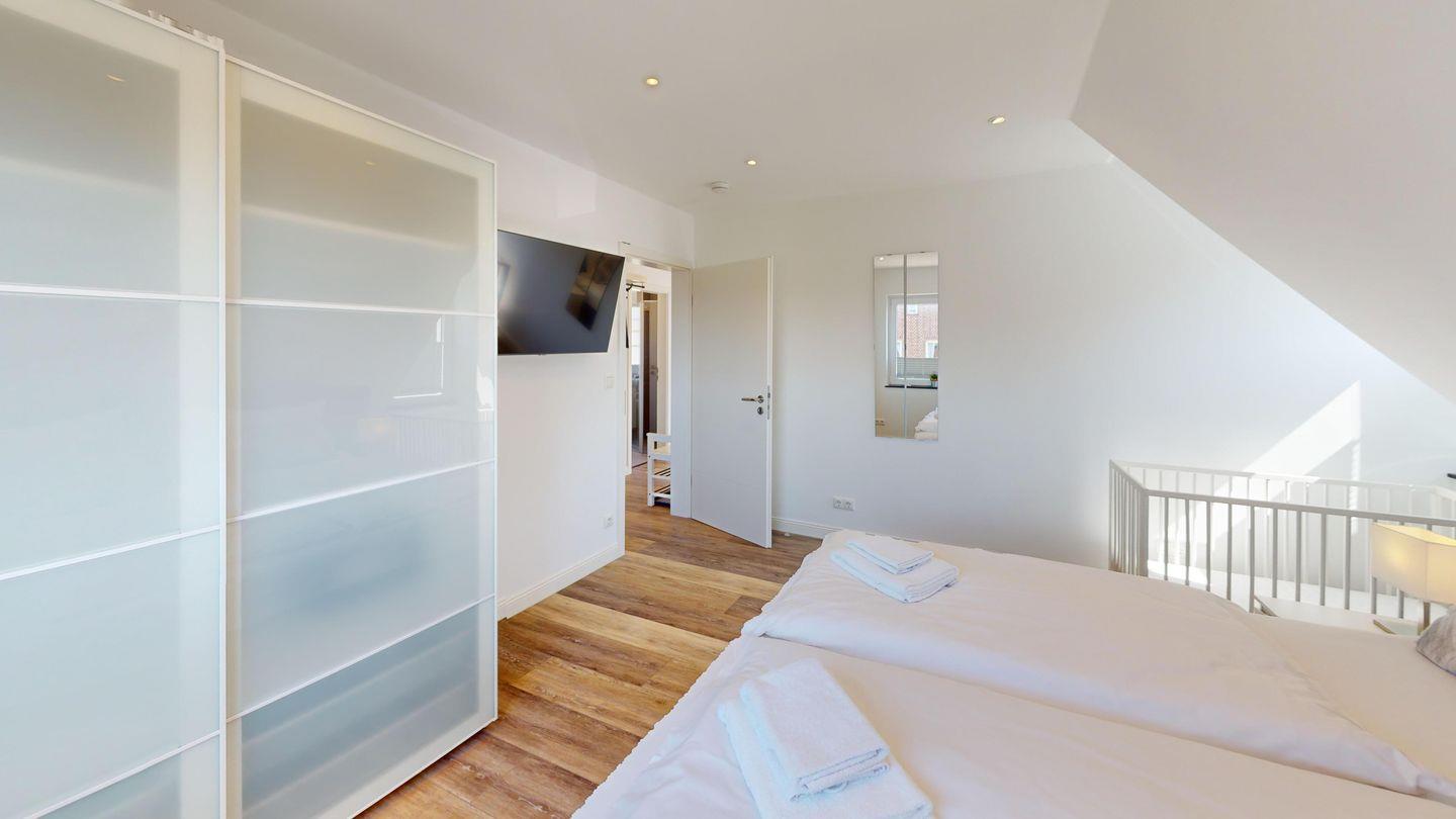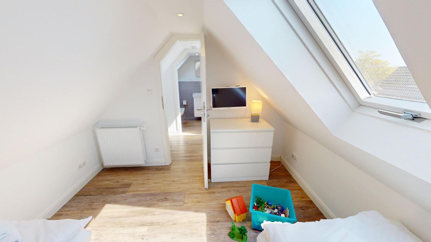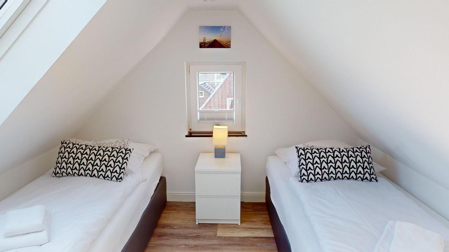 Eins der Schlafzimmer liegt im Dachgeschoss (zwei Einzelboxspringbetten), hier befindet sich auch ein kleines Bad mit WC.