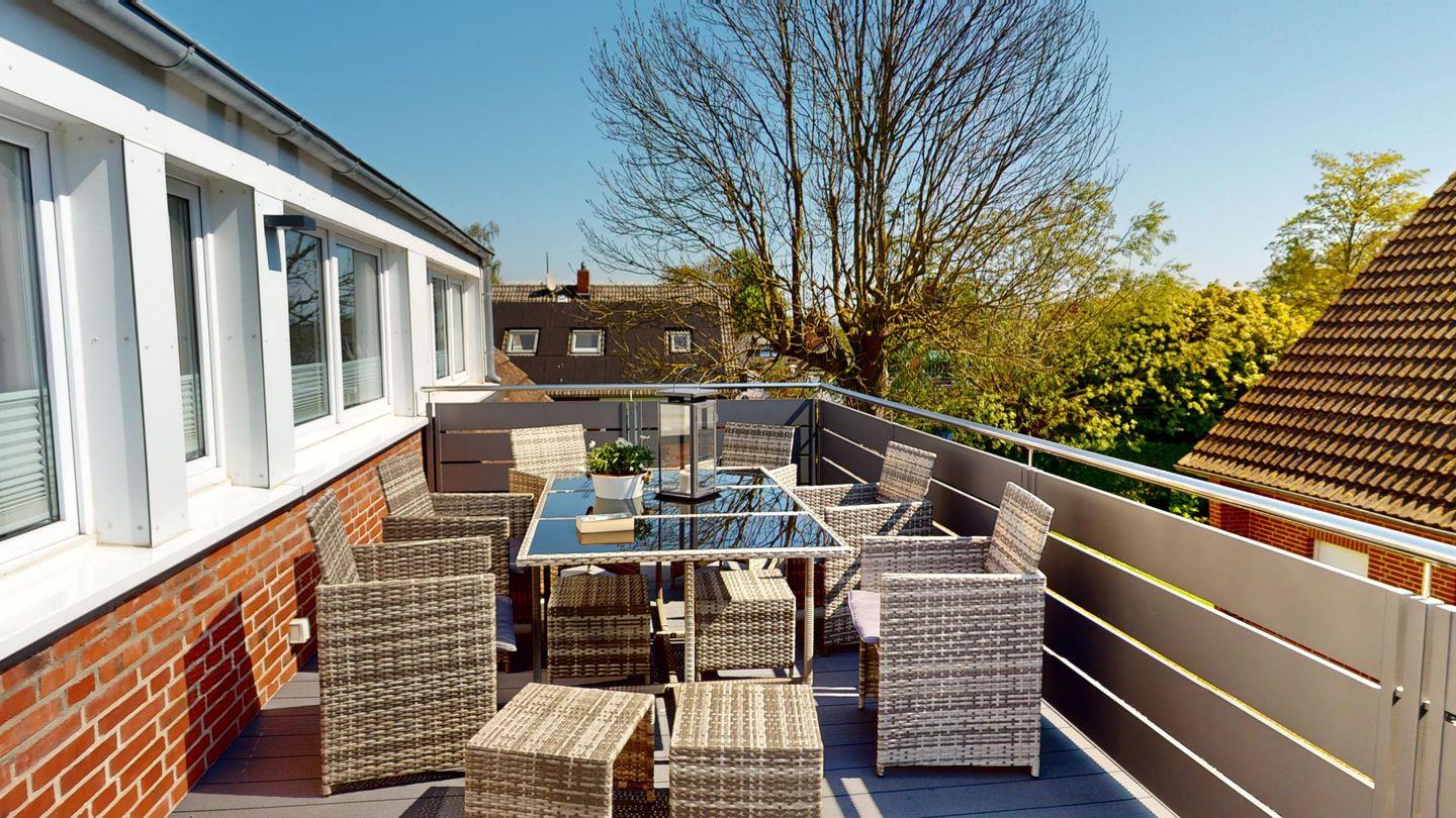 Der offene Wohnbereich mit Küche hat eine Außenterrasse (Süd/Ost). Hier können Sie frühstücken oder laue Sommerabende genießen. Gern dürfen Sie auch den Gemeinschaftsgrillplatz hinter dem Haus benutzen.