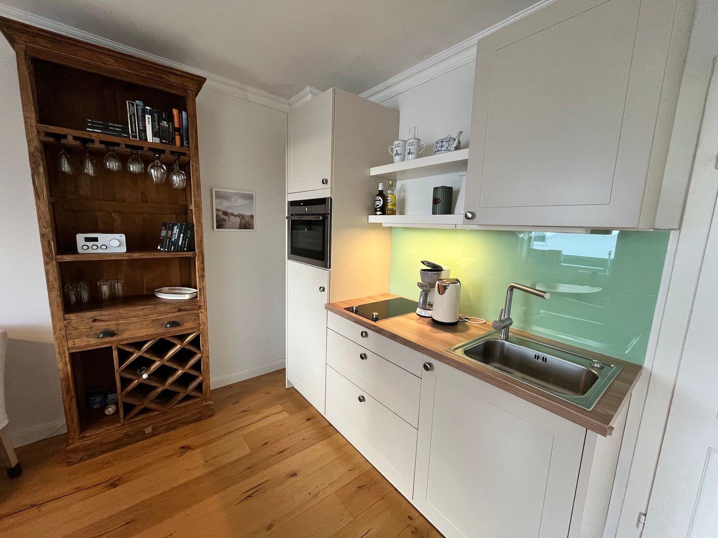 Die neuwertige Einbauküche verfügt unter anderem über einen 2-Platten Herd, einen Backofen und einen Kühlschrank mit Gefrierfach.