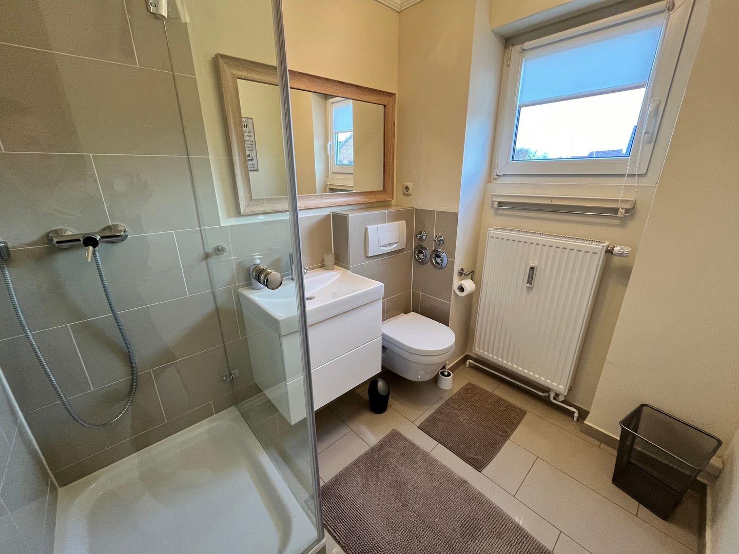 Das Badezimmer hat eine Dusche und ein Fenster. Genügend Ablagefläche finden Sie auch hier, ebenso einen Kosmetikspiegel und einen Fön.