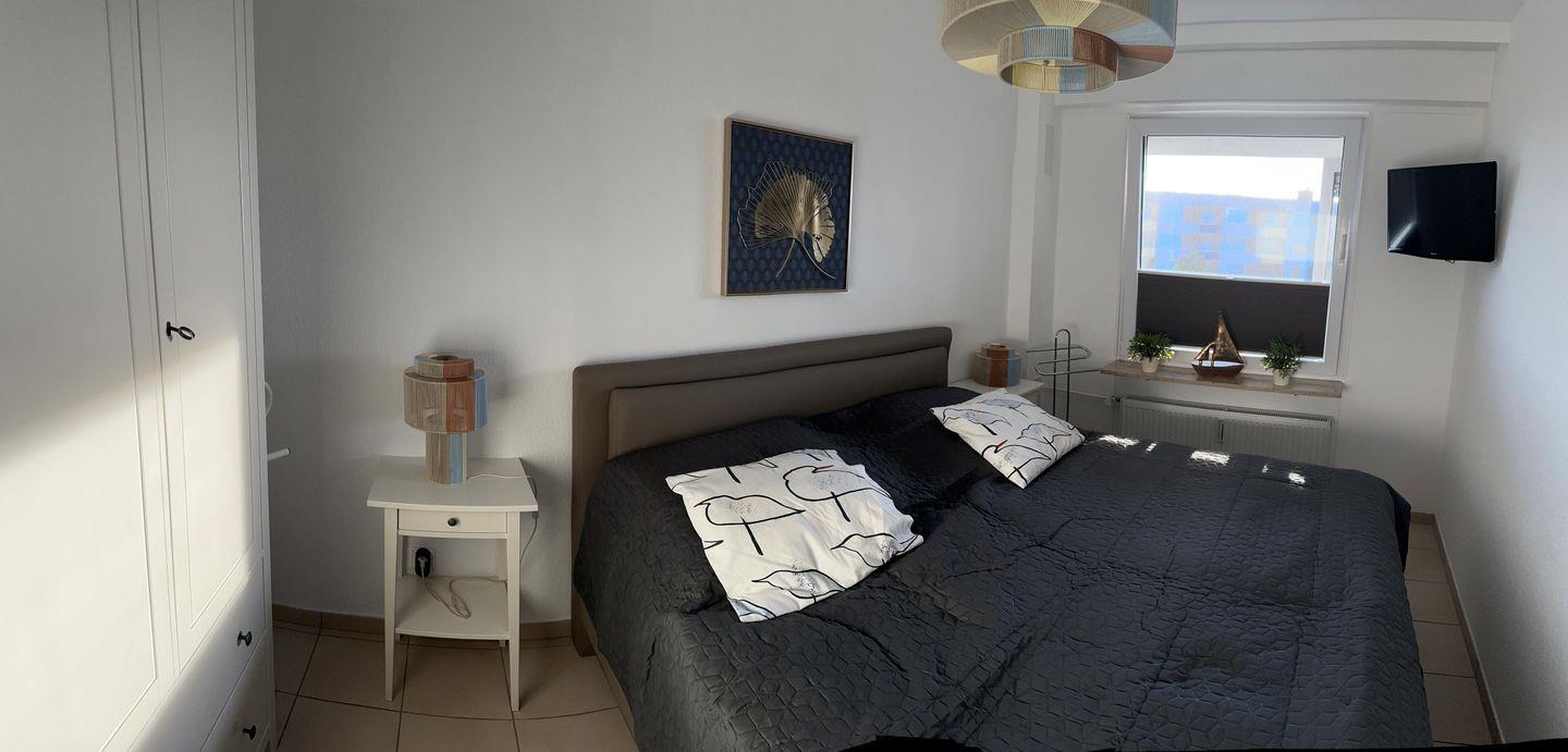 Vom Flur aus gelangen Sie in das gemütliche Schlafzimmer mit Fernseher, Boxspringbett mit Topper (180cm x 200 cm) und einem großzügigen Kleiderschrank für Ihre Urlaubsgarderobe.