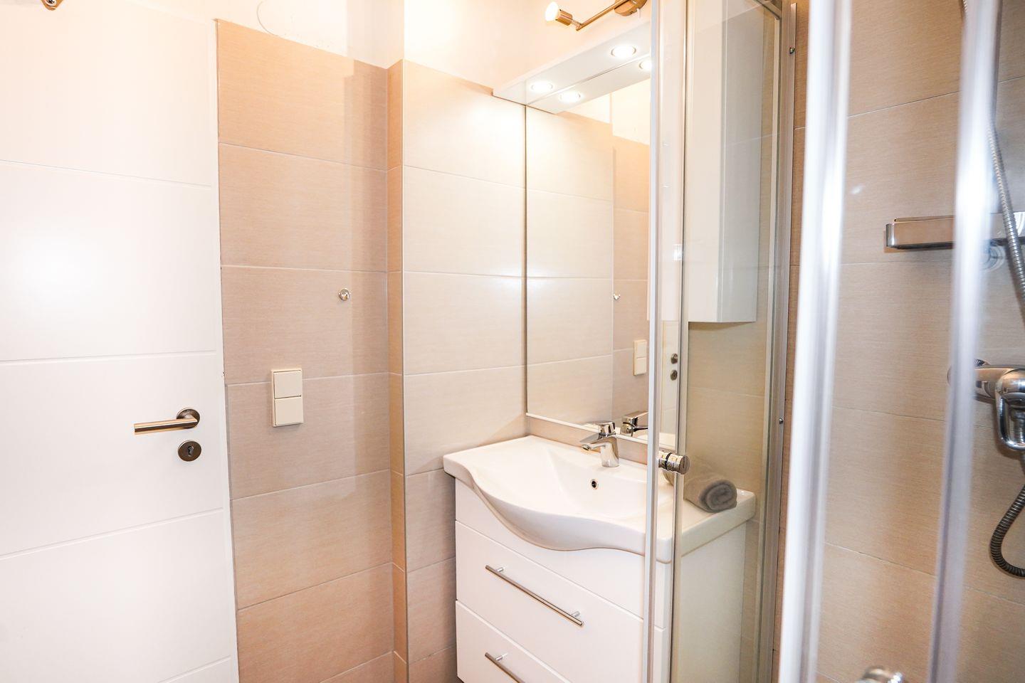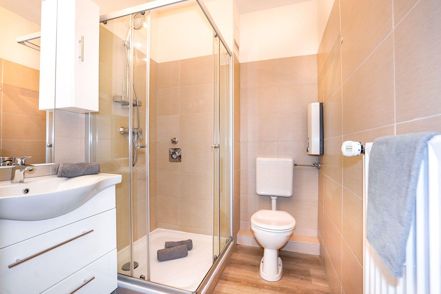 Das helle Badezimmer verfügt über ein WC, Waschtisch, Dusche und Handtuchheizkörper.