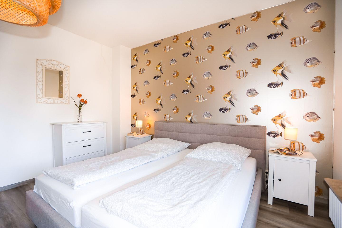 Das Schlafzimmer verfügt über ein Doppelbett (2x90cm x 200cm), einen Kleiderschrank und eine Kommode.