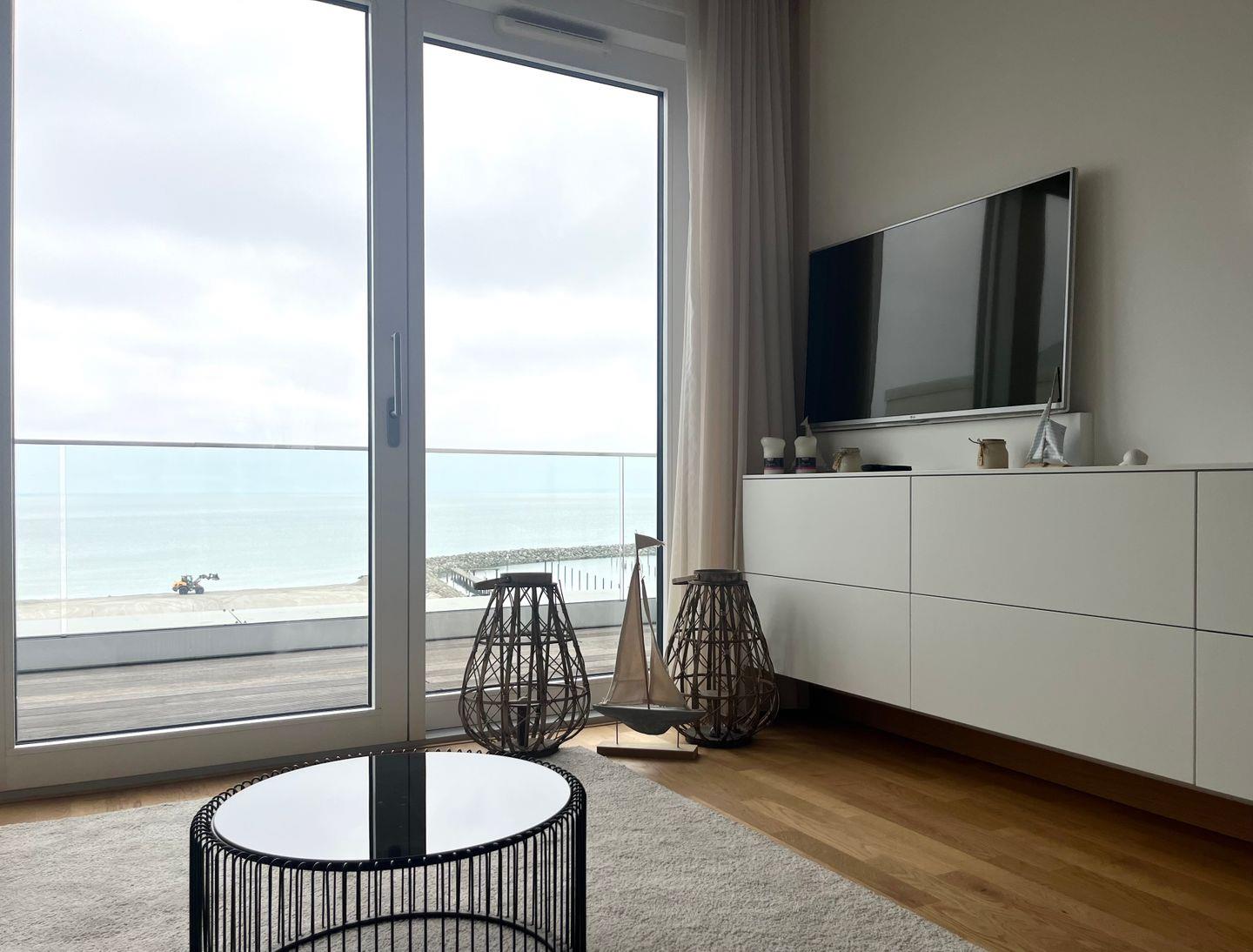 Der helle, gemütliche Wohnraum mit Küchenzeile und De Longhi-Kaffeepadmaschine sowie der fantastische Meerblick begeistert alle! Die Promenade mit der Surfschule sowie der Yachthafen sind direkt vor dem Haus.