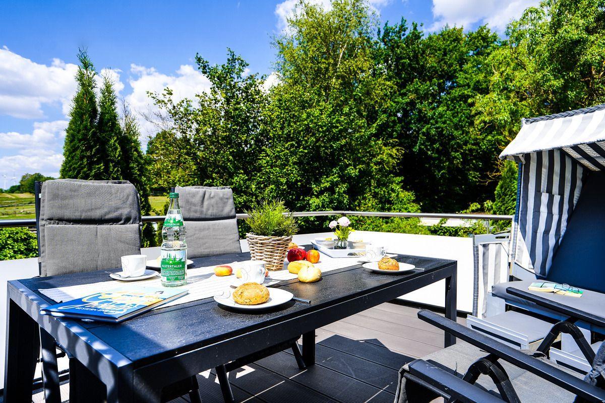 Vom Wohnzimmer gelangen Sie über eine Wendeltreppe ebenfalls auf die große Dachterrasse. Diese verfügt über einen großen Tisch mit Gartenstühlen und einen Strandkorb zum Entspannen und Sonnen.