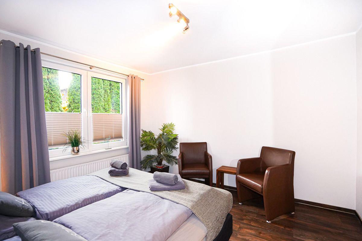 Gemütliche Ferienwohnung "Strandmuschel" mit 2 Schlafzimmern (Boxspringbetten), einem Kinderzimmer mit Etagenbett. Zwei elegante Badezimmer. Heller Wohn- und Essbereich mit eigener Holz-Terrasse, Gartenmöbeln und Strandkorb. Moderne, voll ausgestattete Küche. WLAN, Waschmaschine, Trockner. Entspannen Sie in der hauseigenen Wellnesslounge mit Sauna. Nichtraucherunterkunft, Haustiere erlaubt.