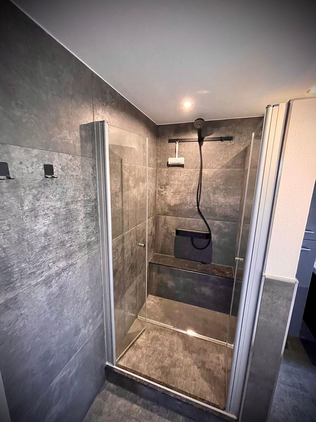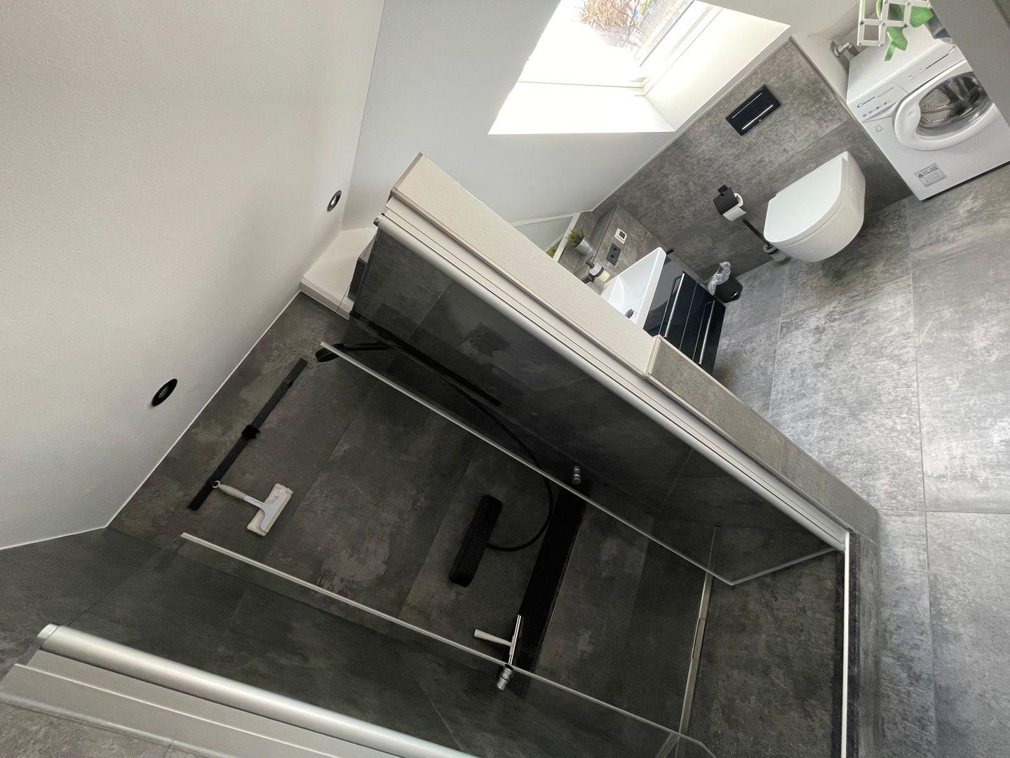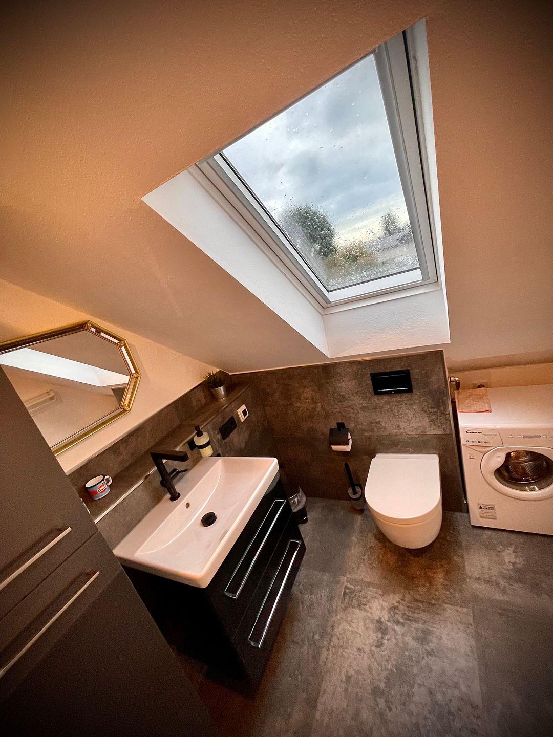 Das moderne Badezimmer (mit Fenster) ist mit einer Fußbodenheizung, kleiner Waschmaschine, Fön usw. ausgestattet.