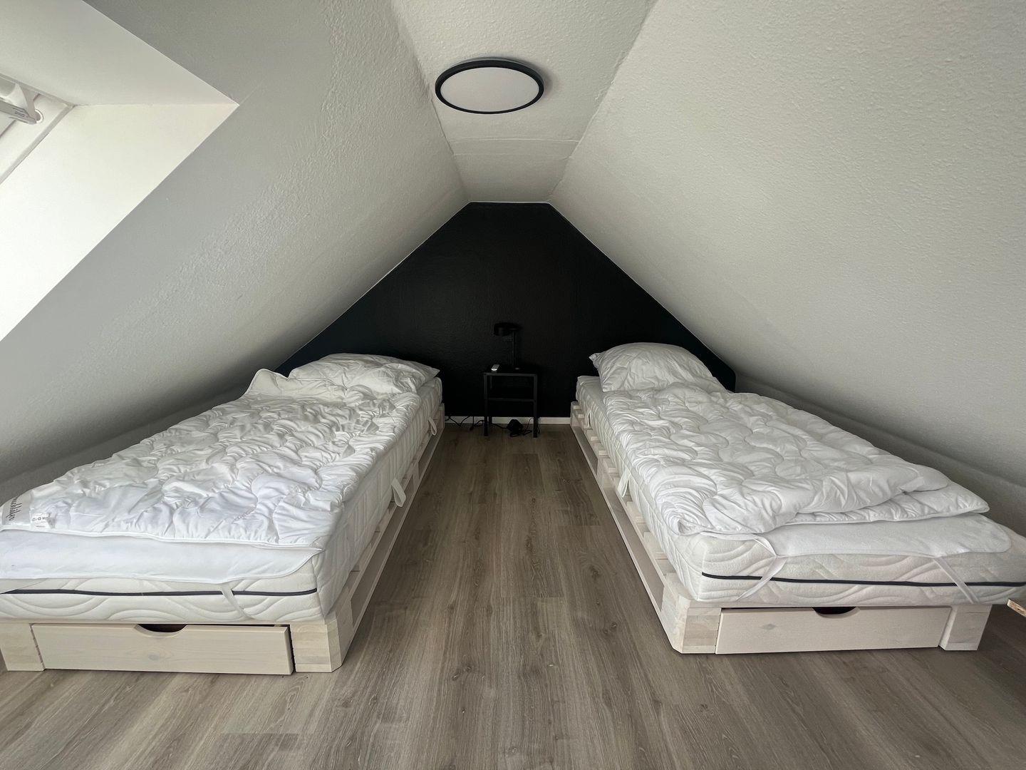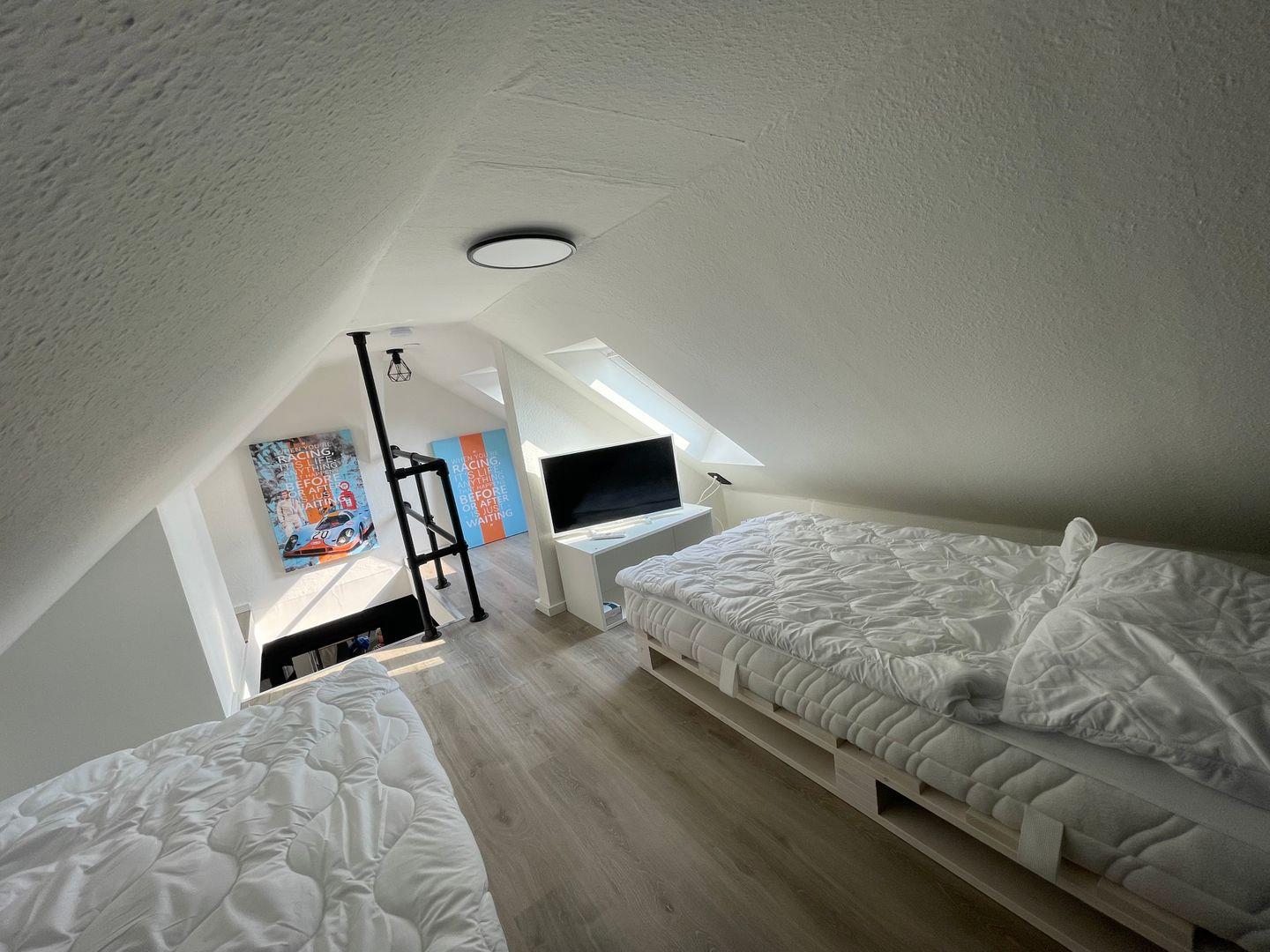 Die Wohnung verfügt über 4 Schlafmöglichkeiten. Ein Schlafzimmer mit Doppelbett (2x90x200cm) und zwei einzelnen Betten (90x200cm) im ausgebauten Spitzboden (keine Stehhöhe für Erwachsene), welche über eine Hühnerleiter zu erreichen sind.