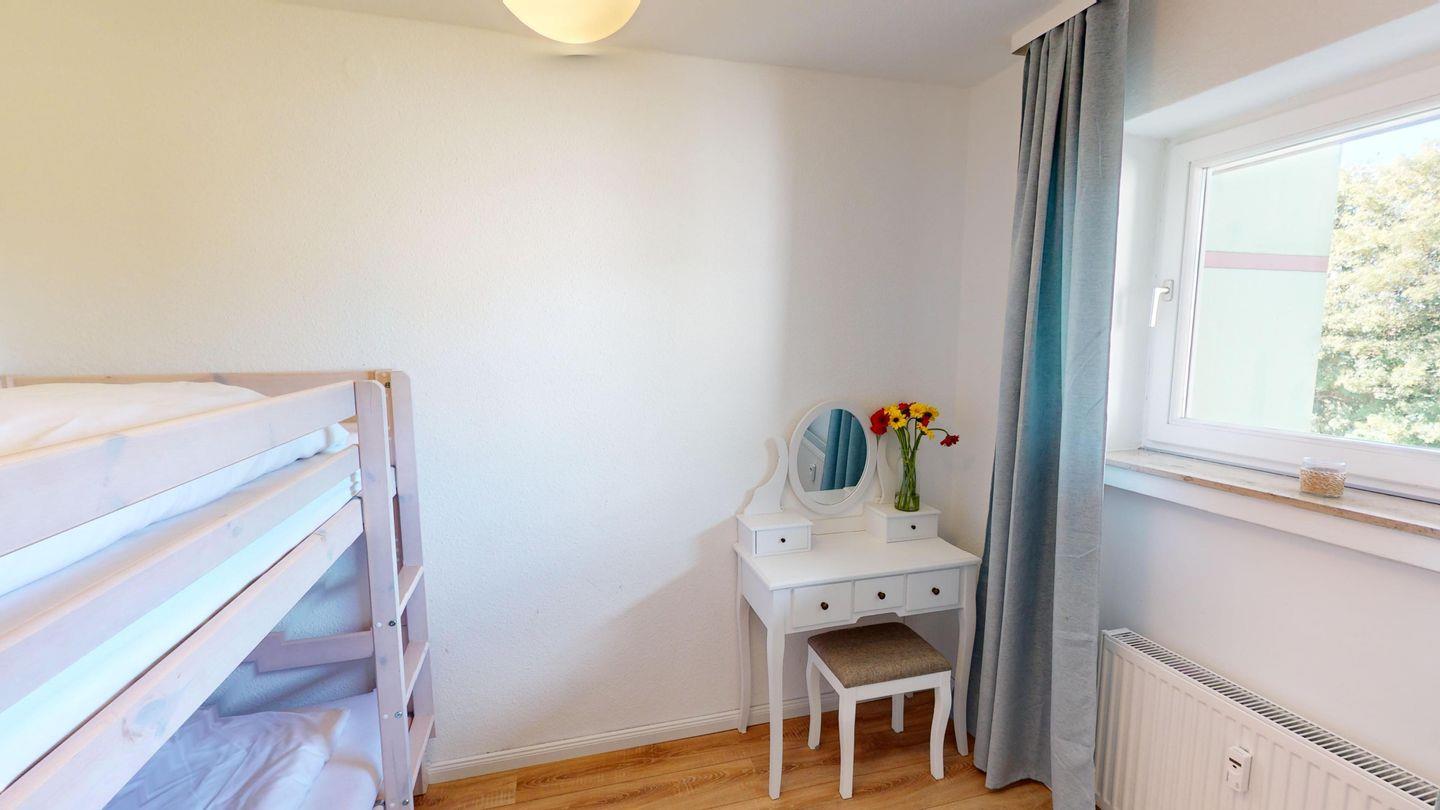 Das Kinderzimmer ist mit einem Etagenbett und einem Tisch mit Hockern ausgestattet. Das Bad verfügt über eine Dusche und einen Föhn.