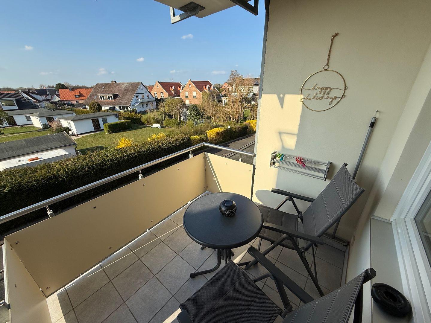 Vom Wohnzimmer gelangen Sie auf dem Balkon, hier können Sie bis in den späten Abend die Sonne genießen.