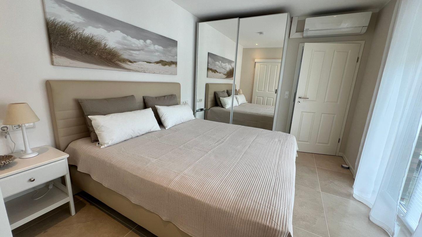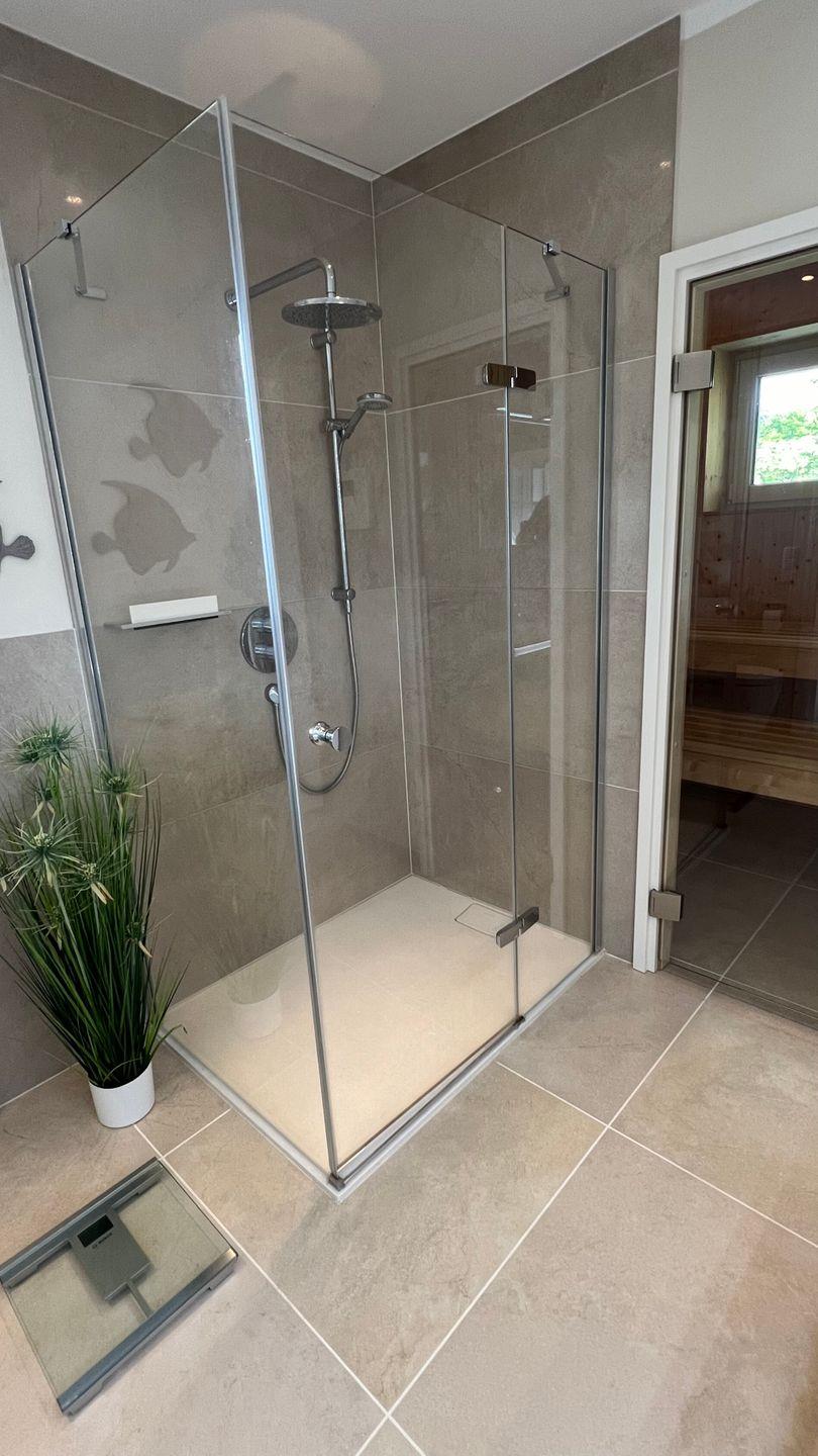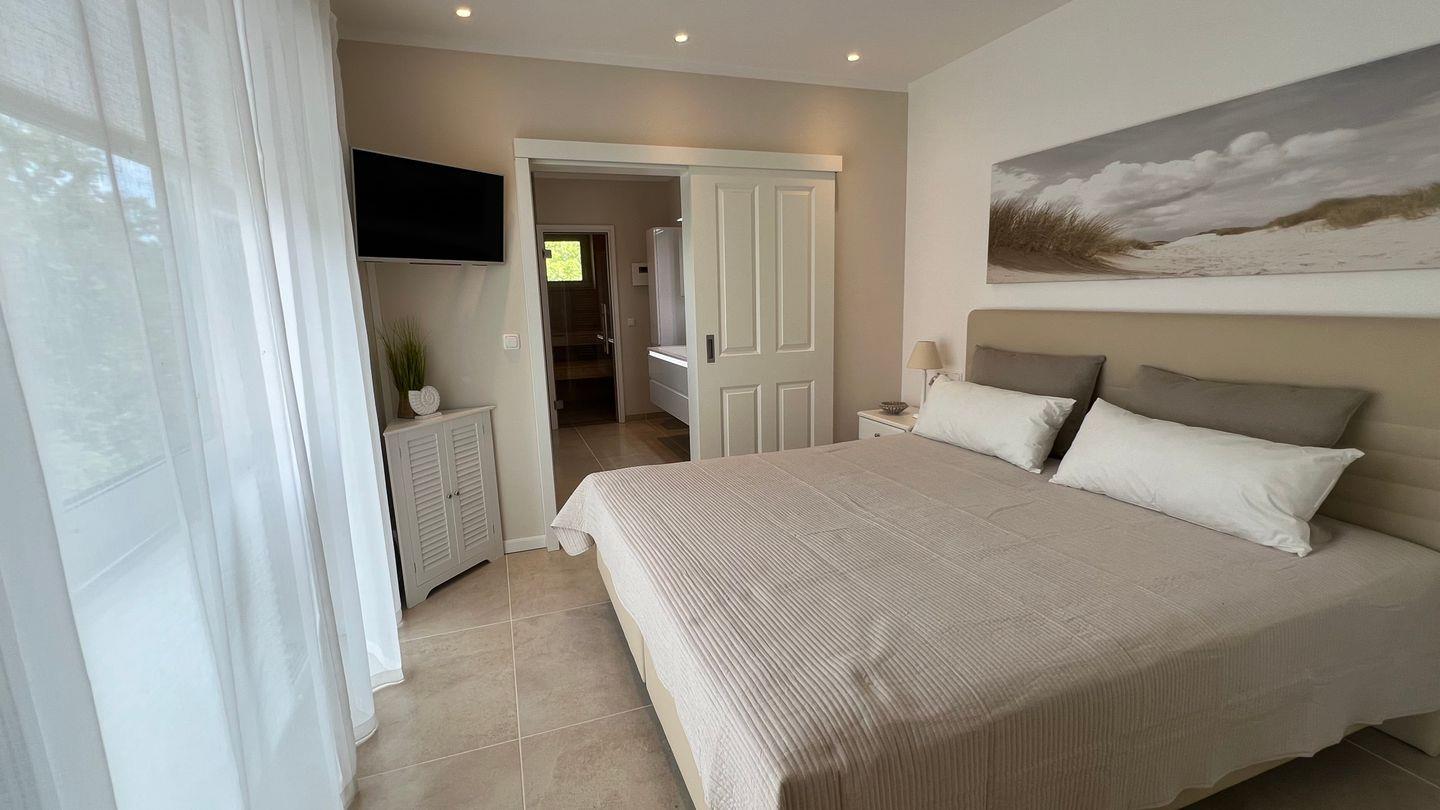 Vom Flur aus gelangen Sie in das Schlafzimmer mit Bad en suite und Regendusche, in dem sich auch eine Sauna für bis zu vier Personen befindet. Das besondere Extra der Sauna: ein Fenster mit direktem Blick in den Kurpark! Das Schlafzimmer ist für die heißen Tage mit einer Klimaanlage ausgestattet und lässt sich durch die elektrischen Fenster-Jalousien vollständig verdunkeln. Außerdem befinden sich mehrere Plissees an den bodentiefen Schlafzimmerfenstern, sodass auch bei geöffneten Jalousien kein Einblick von außen möglich ist.