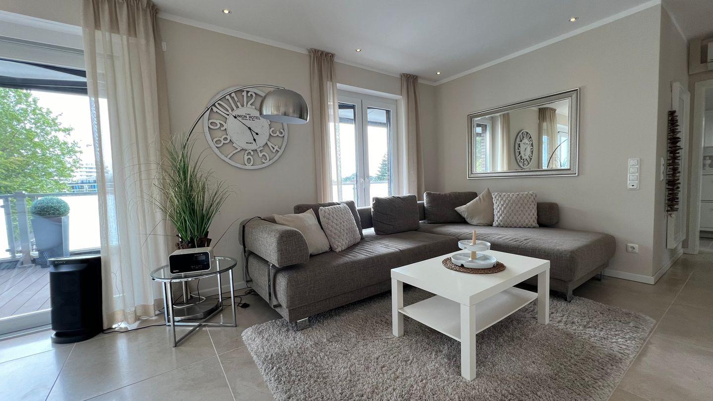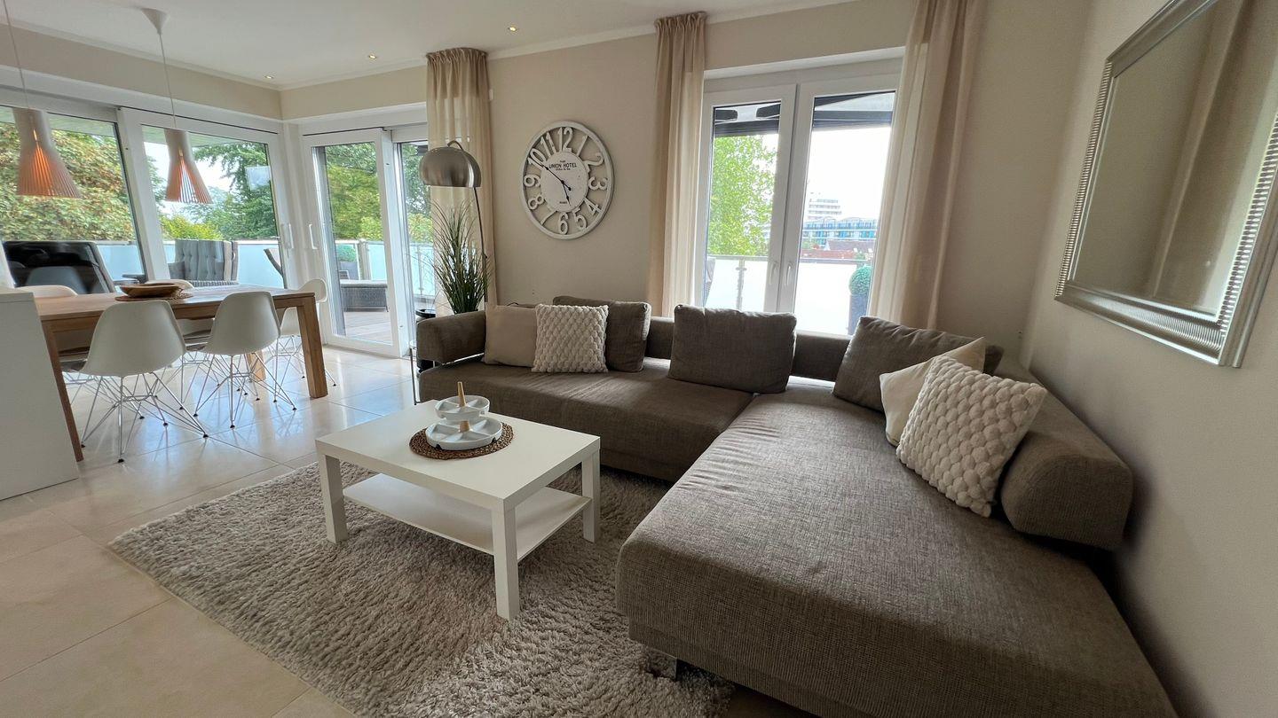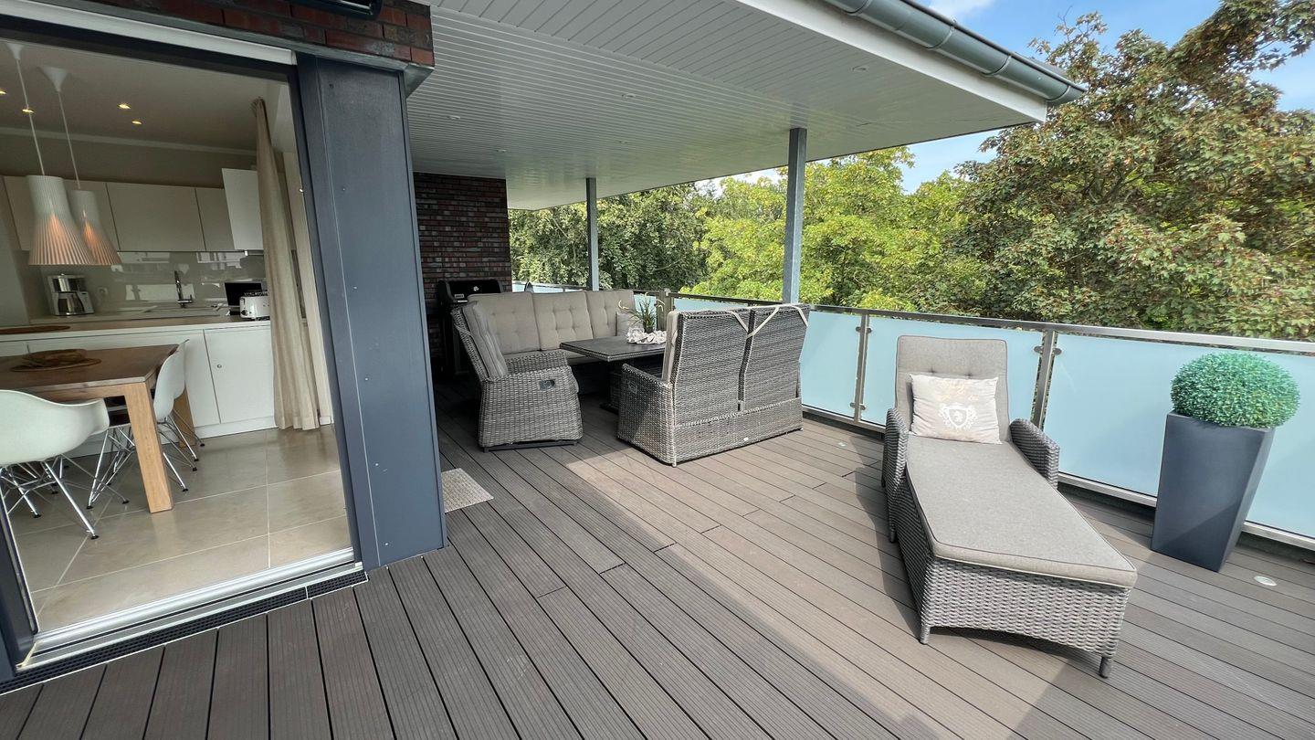 Vom Flur geht es weiter in das großzügige Wohnzimmer mit offener Küche und Zugang zur Dachterrasse, die Ihnen einen erholsamen Blick in den Kurpark bietet. Durch die Südost-Ausrichtung der Dachterrasse können Sie den ganzen Tag die Sonne in vollen Zügen genießen und sich gleichzeitig auch im überdachten Terrassenbereich erholen. Dort stehen Ihnen auch ein zweiter Getränkekühlschrank und ein Weber-Gasgrill (inkl. Gas) sowie eine Sony Soundbox (von Ihrem Smartphone per Bluetooth steuerbar) zur Verfügung. Auf der Dachterrasse befindet sich im überdachten Bereich eine Sitzgruppe für 6 Personen. Des Weiteren stehen Ihnen auf der langen Terrassenseite zwei Sonnenliegen, eine kleine Sitzgruppe und ein Strandkorb zur Verfügung. In diesem Bereich schützt Sie bei Bedarf eine 7m lange Markise vor Sonneneinstrahlung.