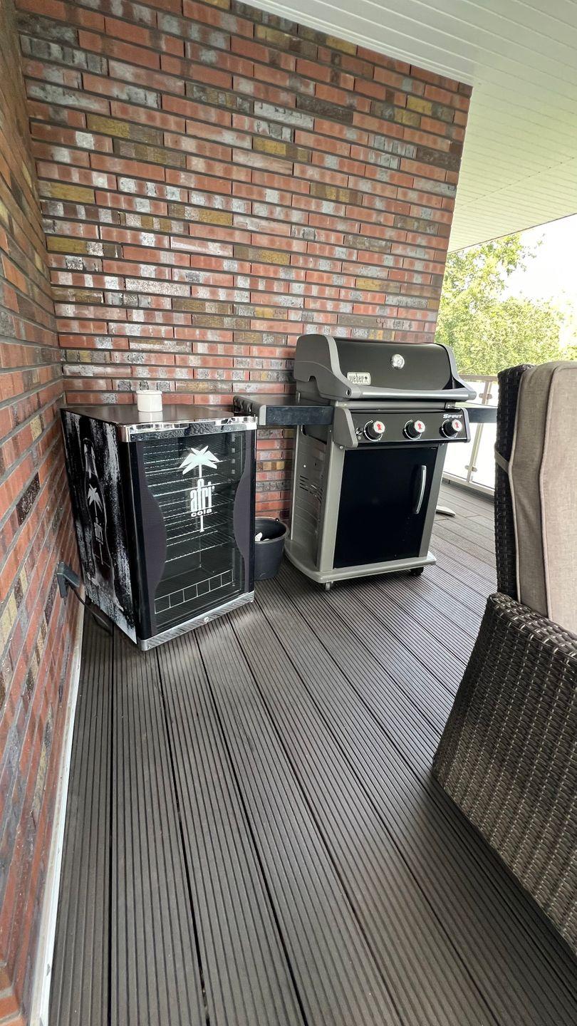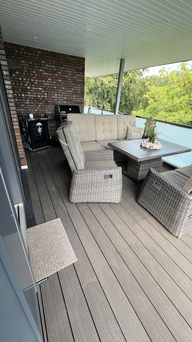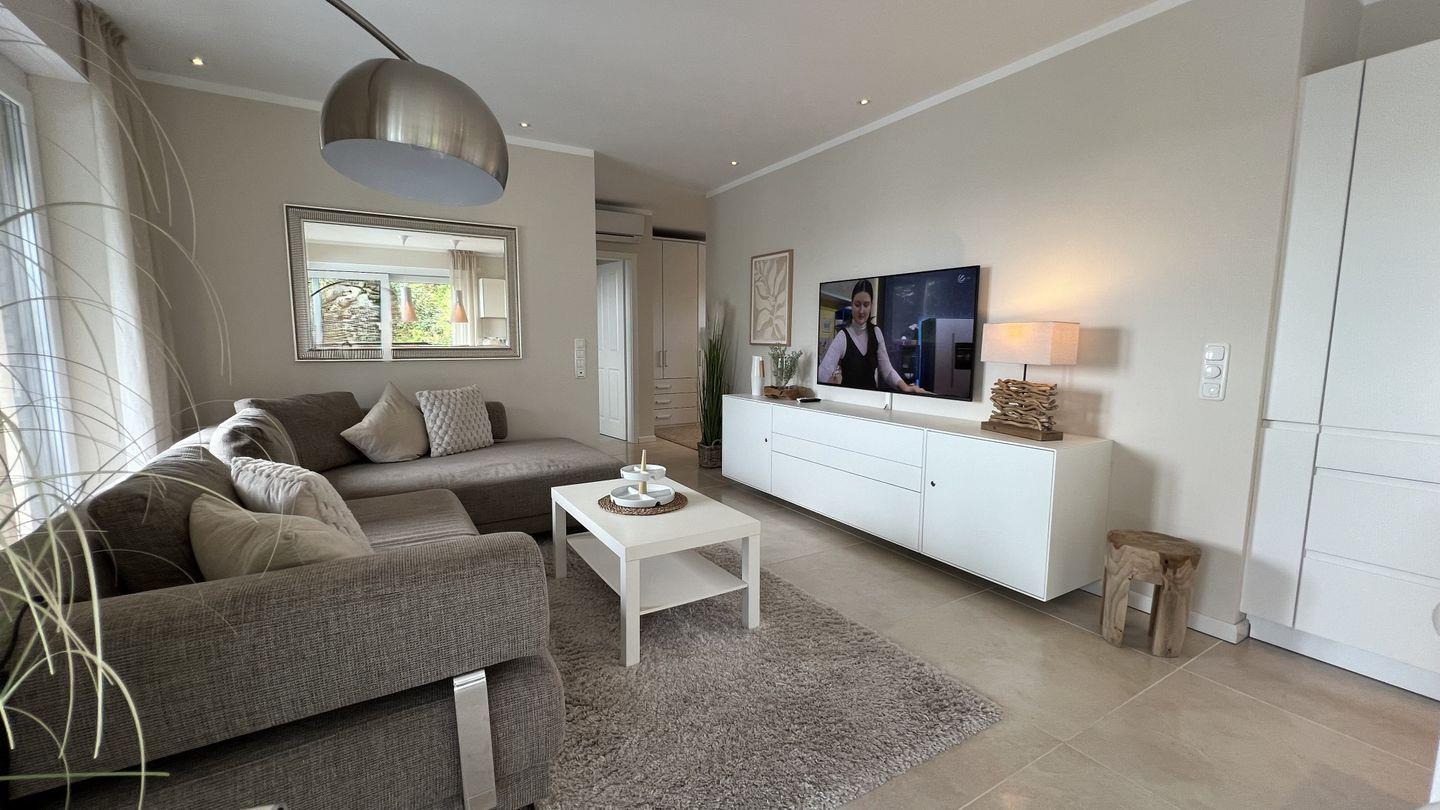 Vom Flur geht es weiter in das großzügige Wohnzimmer mit offener Küche und Zugang zur Dachterrasse, die Ihnen einen erholsamen Blick in den Kurpark bietet. Durch die Südost-Ausrichtung der Dachterrasse können Sie den ganzen Tag die Sonne in vollen Zügen genießen und sich gleichzeitig auch im überdachten Terrassenbereich erholen. Dort stehen Ihnen auch ein zweiter Getränkekühlschrank und ein Weber-Gasgrill (inkl. Gas) sowie eine Sony Soundbox (von Ihrem Smartphone per Bluetooth steuerbar) zur Verfügung. Auf der Dachterrasse befindet sich im überdachten Bereich eine Sitzgruppe für 6 Personen. Des Weiteren stehen Ihnen auf der langen Terrassenseite zwei Sonnenliegen, eine kleine Sitzgruppe und ein Strandkorb zur Verfügung. In diesem Bereich schützt Sie bei Bedarf eine 7m lange Markise vor Sonneneinstrahlung.