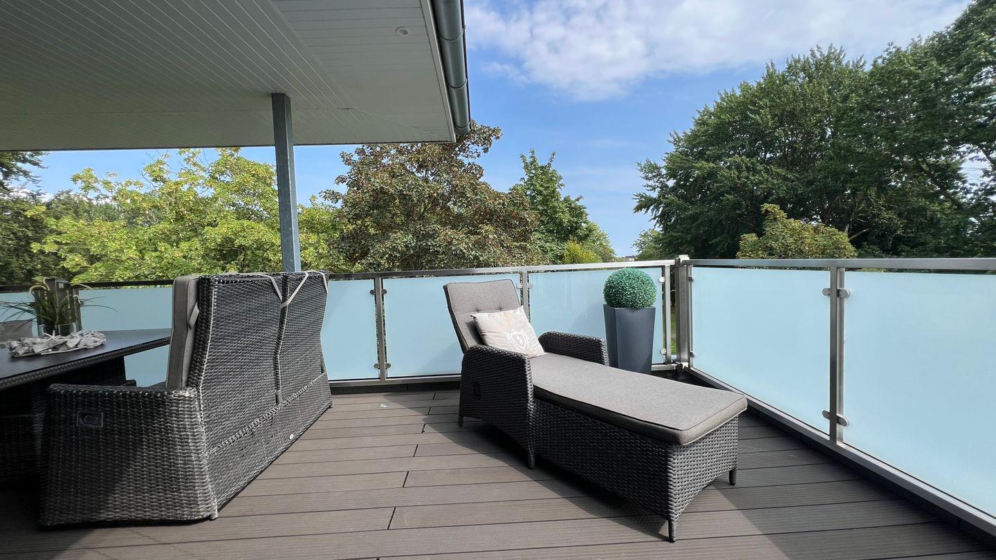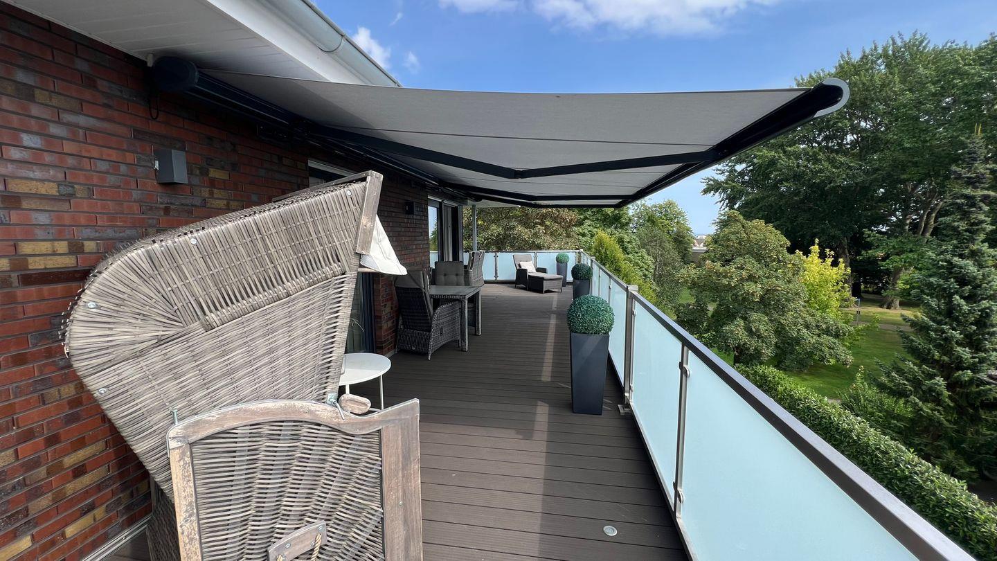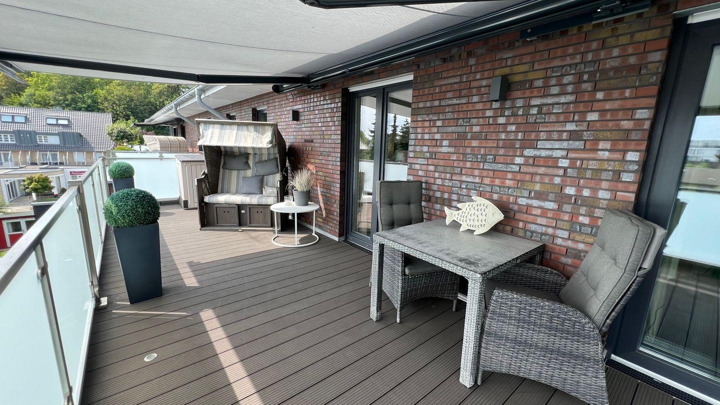 Perfekte Erholung in ruhiger Lage mit absoluter Privatsphäre im top ausgestatteten Penthouse mit traumhaftem Blick auf die Baumkronen des Grömitzer Kurparks zur einen Seite der 52qm großen Dachterrasse und zur anderen Seite auf das Hotel Carat und die Ostsee.