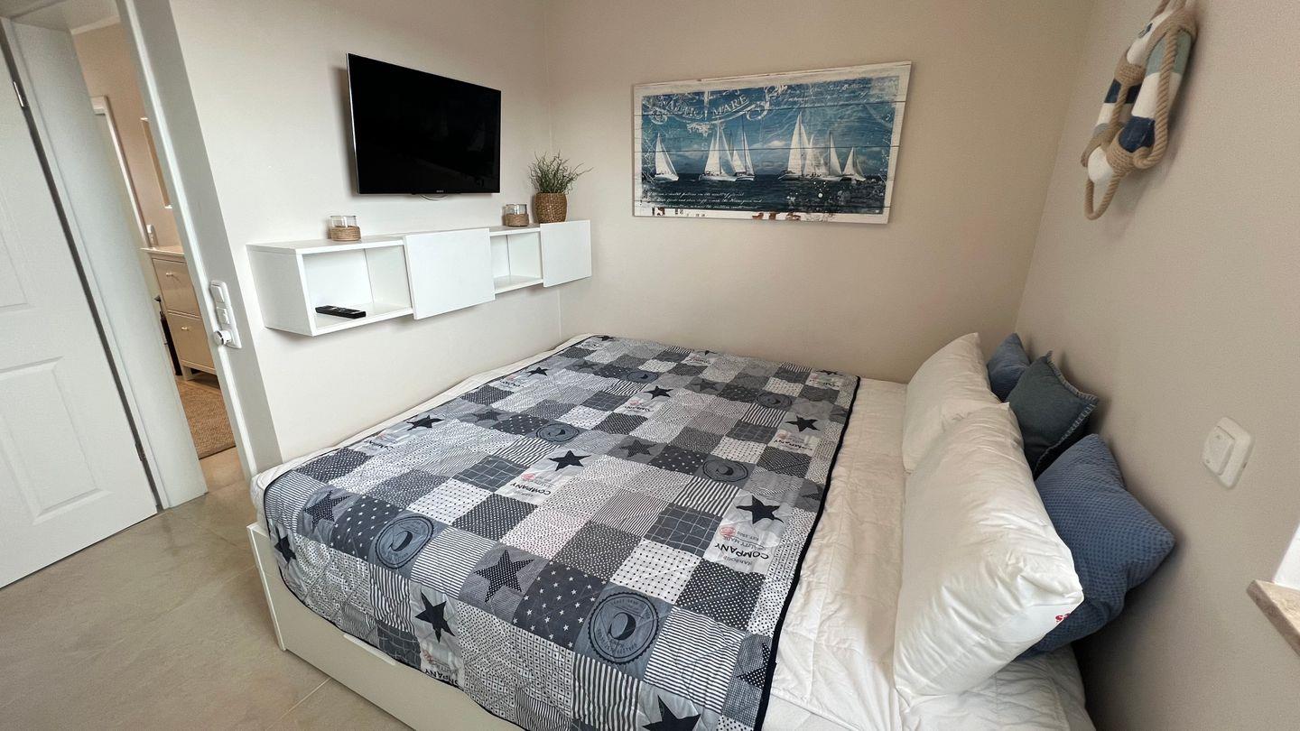 Vom Flur aus gelangen Sie auch in das kleinere Schlafzimmer, mit großem Doppelbett und ebenfalls mit Bad en suite, ideal für Ihre Kinder jeden Alters oder zwei weitere Erwachsene. Auch dieses Schlafzimmer lässt sich durch die elektrischen Fenster-Jalousien vollständig verdunkeln und verfügt über einen 32 Zoll großen Sony Fernseher, einen eigenen Kleiderschrank und Schuhschrank.