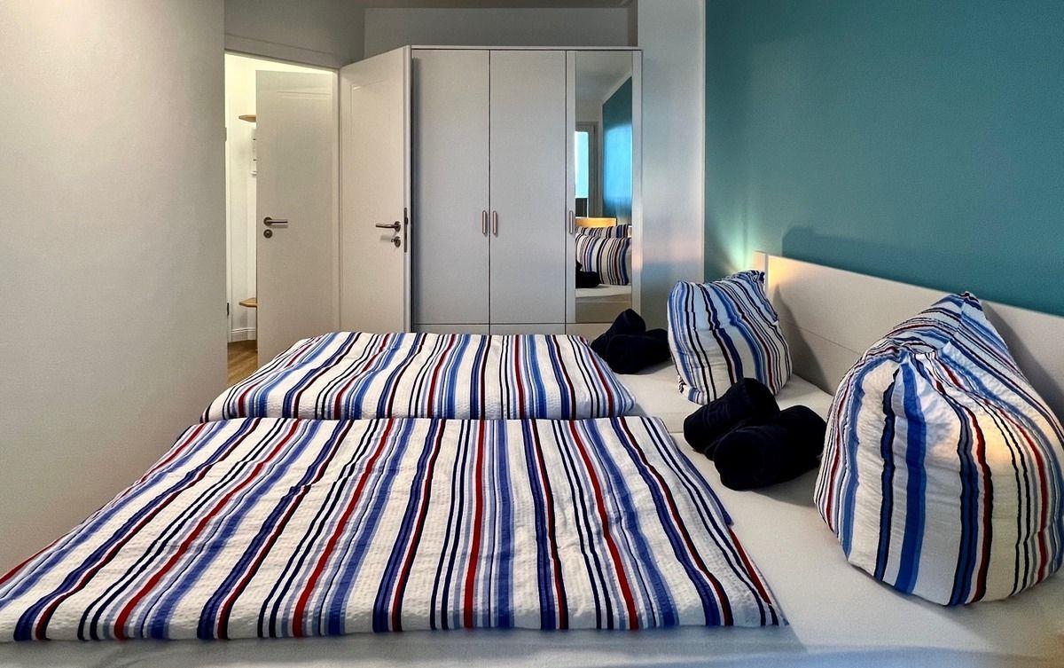 Vom Flur aus gelangen Sie in das gemütliche Schlafzimmer mit Doppelbett (2x 90x200 cm) und einem großzügigen Kleiderschrank für Ihre Urlaubsgarderobe, sowie einem Fernseher.