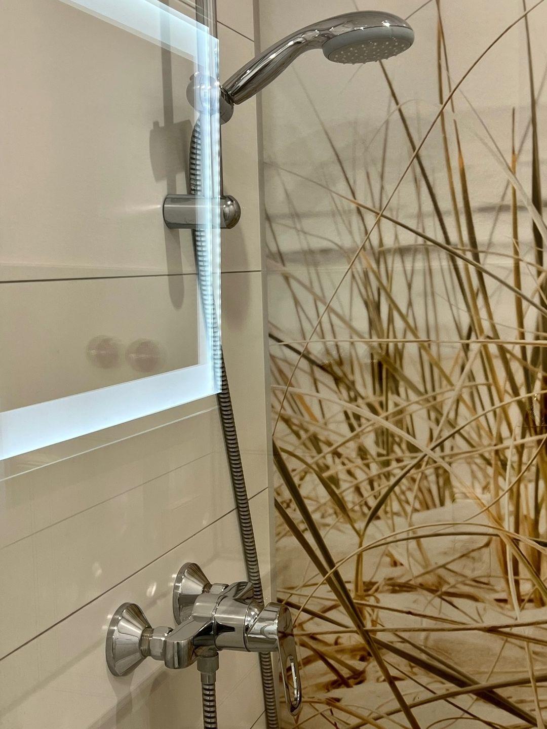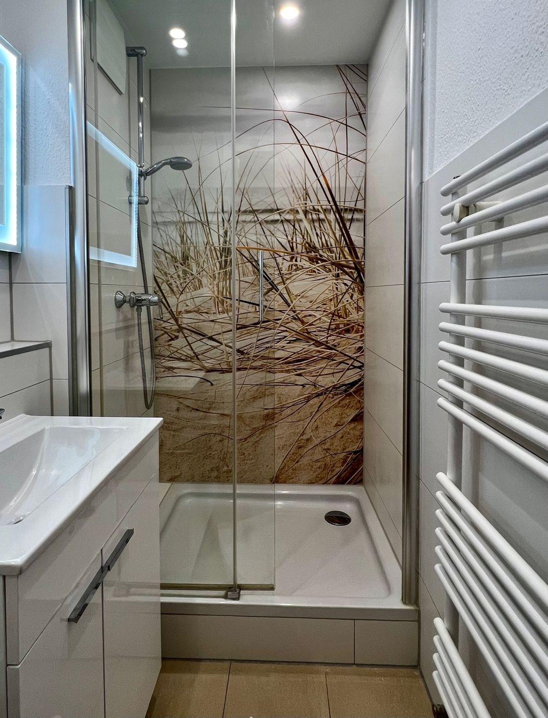 Das moderne Duschbad weckt direkt die ersten Urlaubsgefühle und ist mit einer Dusche, Waschbecken und Föhn ausgestattet. Das WC befindet sich separat.