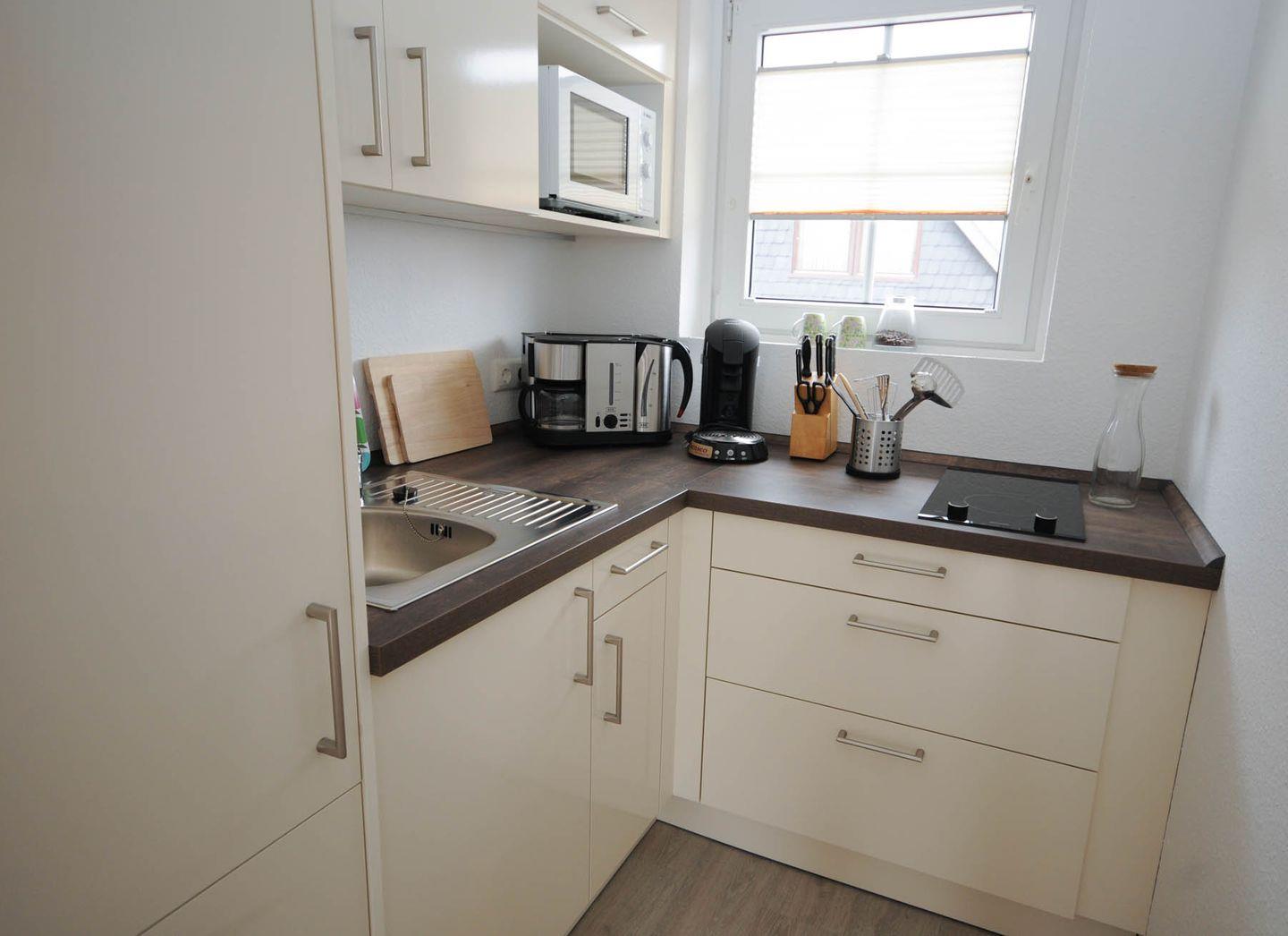 Direkt neben dem Wohnbereich befindet sich die separate Küche, die mit allem ausgestattet ist, was Sie für den täglichen Bedarf benötigen. Für Unterhaltung ist ebenfalls gesorgt: Mit schnellem WLAN (50 Mbit/s im Download) können Sie Filme streamen oder Musik genießen – ideal für gemütliche Stunden drinnen.